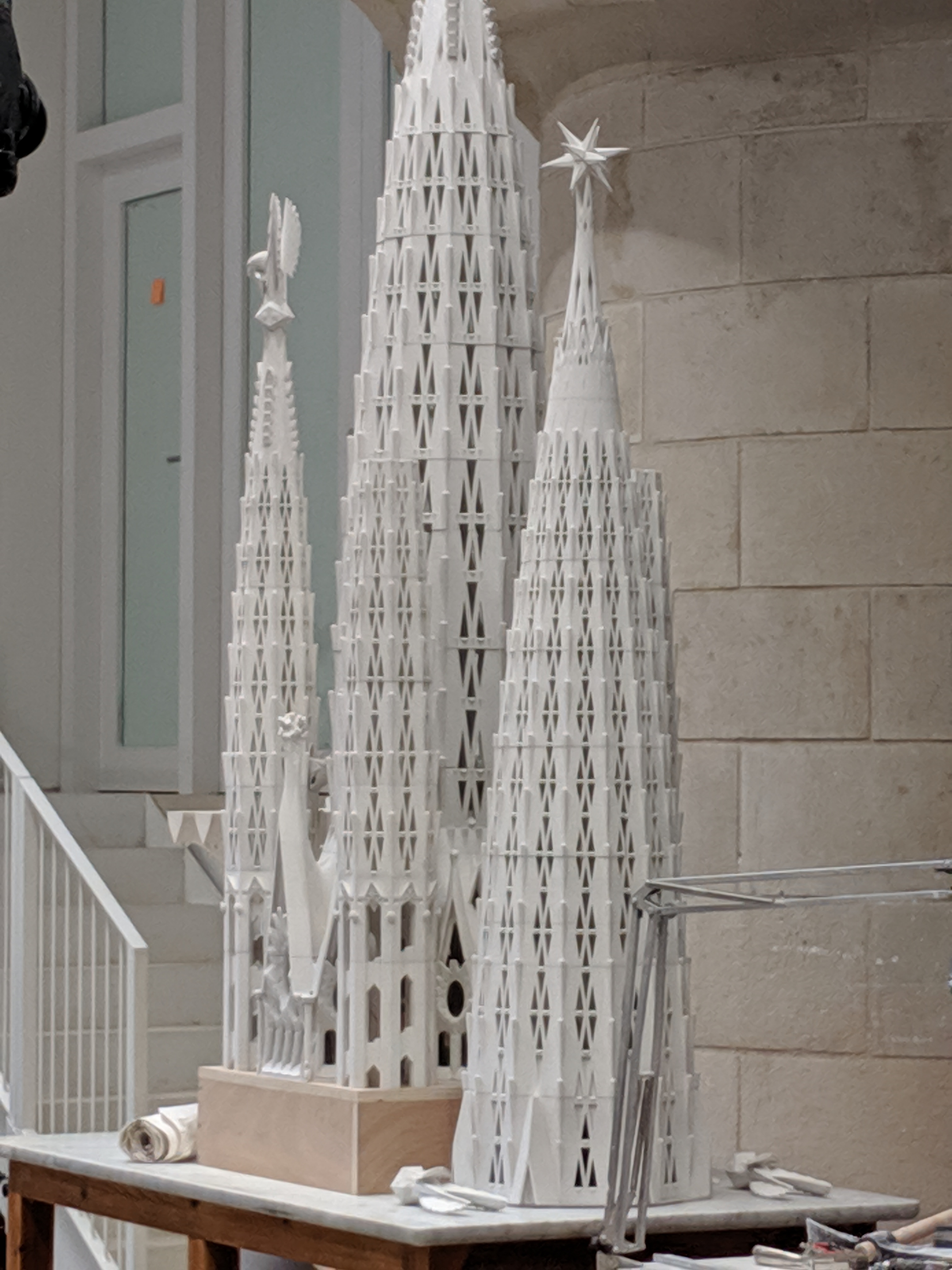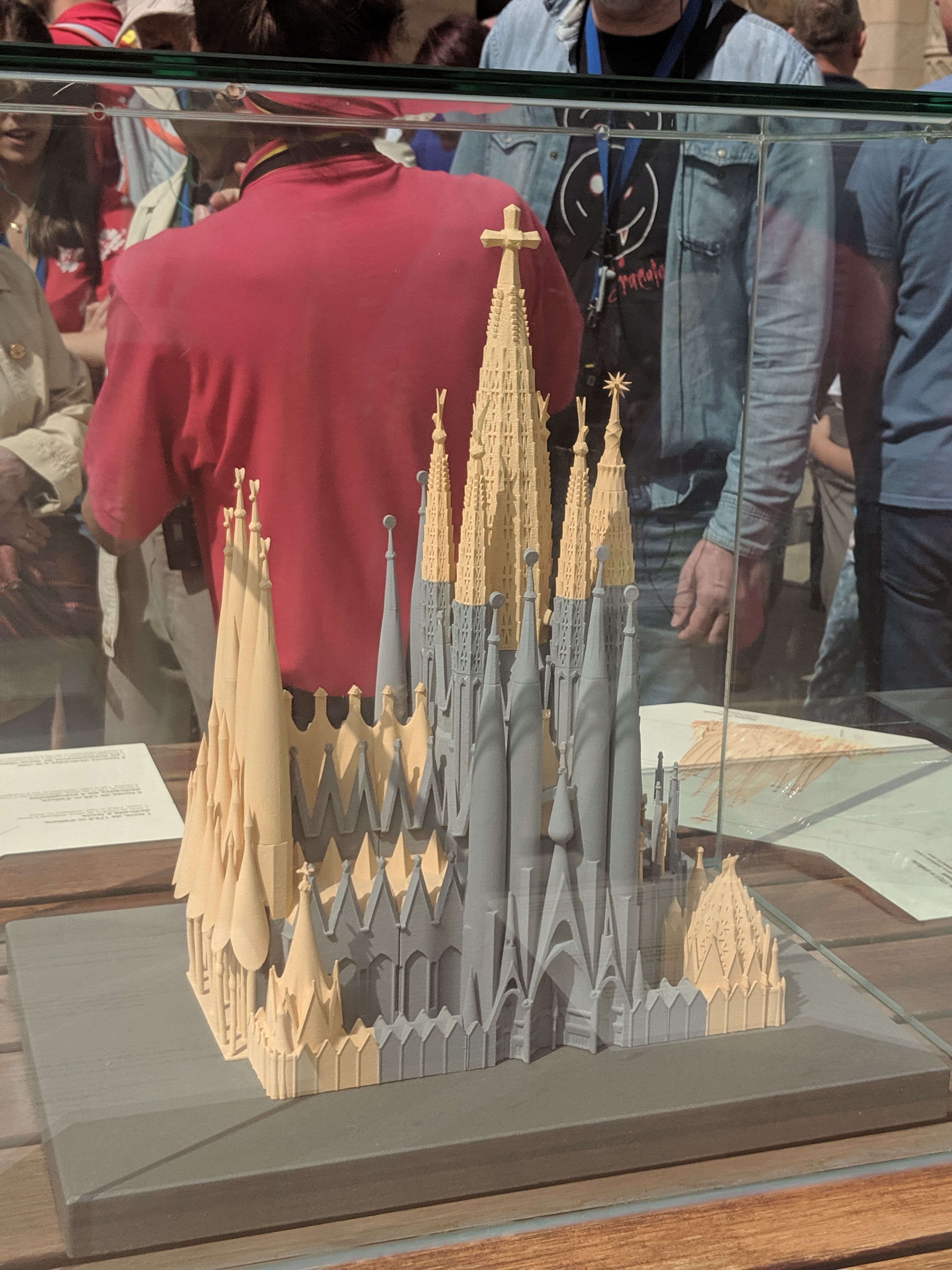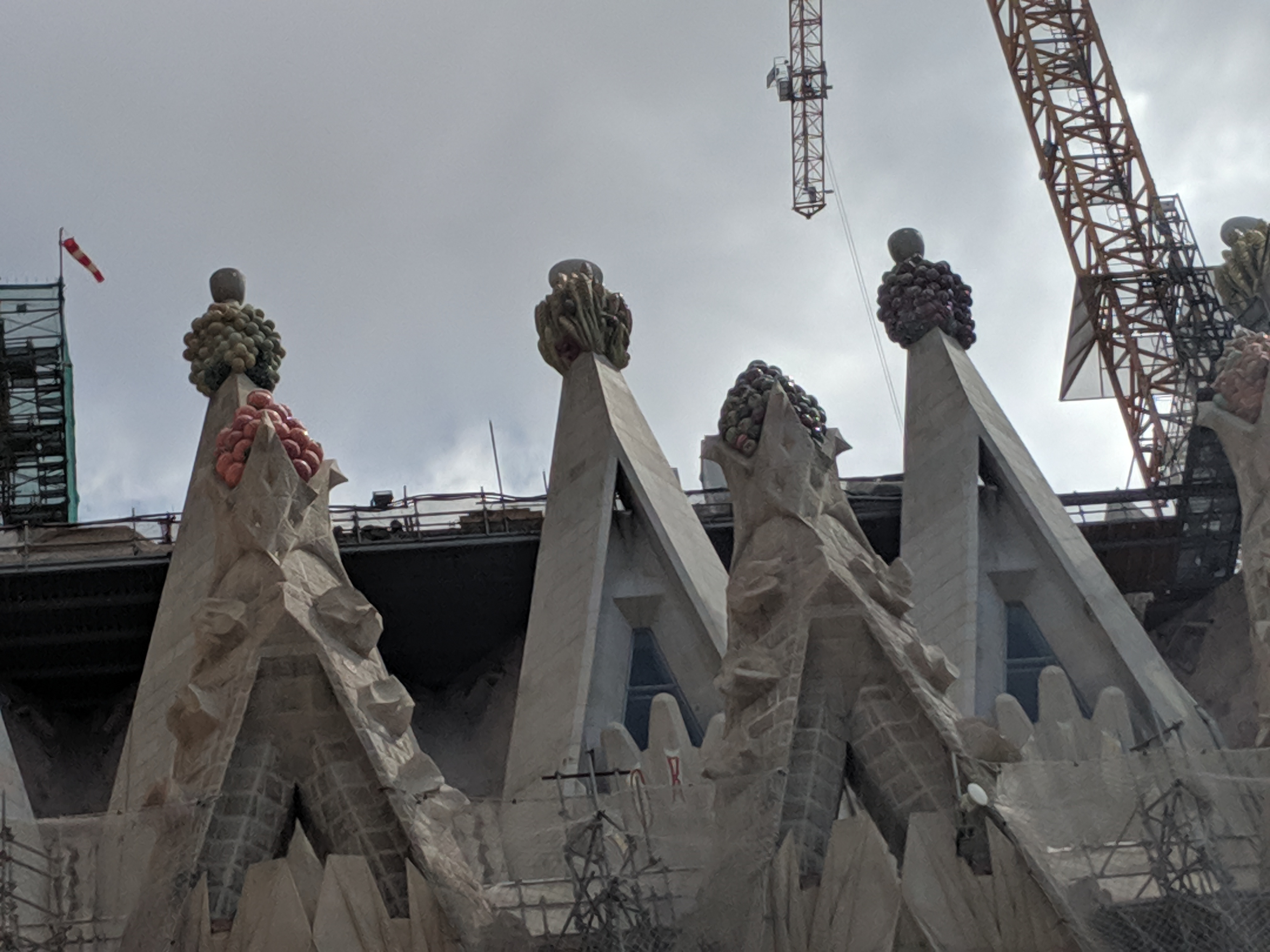 Below, you will see many pictures of the exterior. I won’t go into detail, but there is just so much here. The first picture is of the door on the “Passion” side. The words on the door all relate to the Crucifixion or the Passion of Christ. The second and third pictures show the magnitude of La Sagrada Familia. The last picture on the top row shows the completed parts in gray and the uncompleted parts in yellow. As you can see, there is much to be done before 2026! In the second row, are more exterior pictures including the angels rejoicing the birth, the fruits on top of the spires on the Passion side, another view of the passion side, and a working model of the four main spires that are currently being worked on.