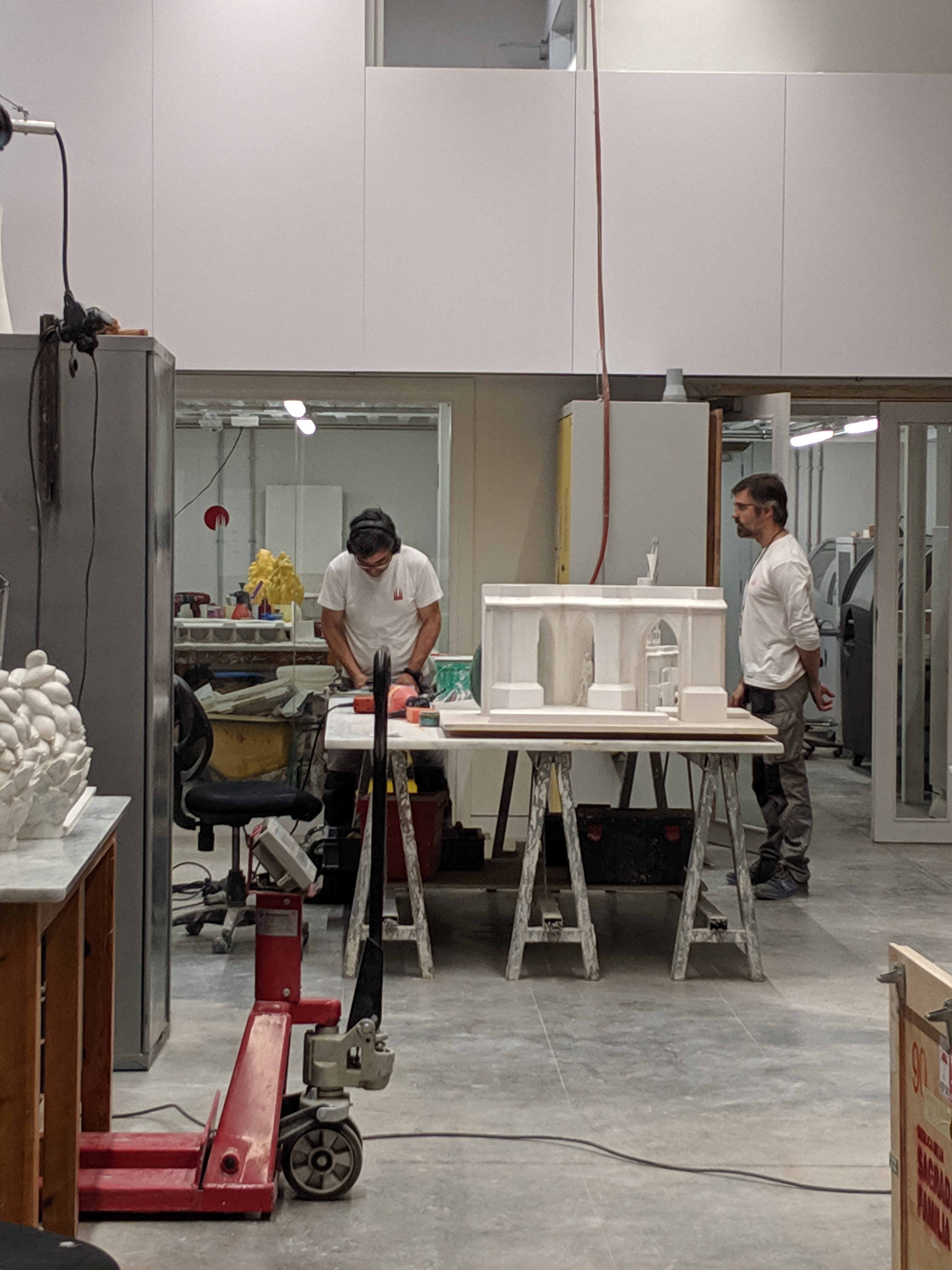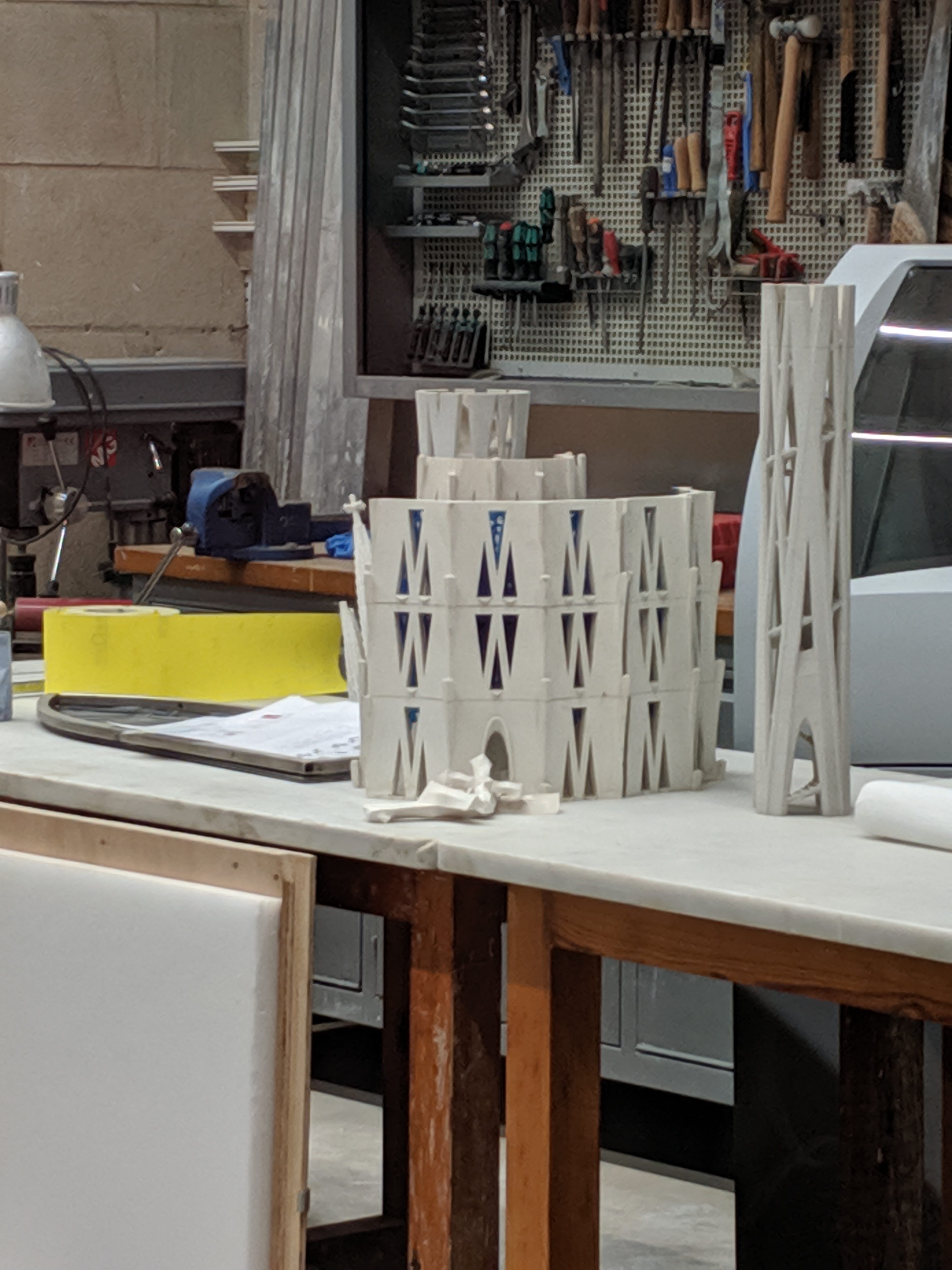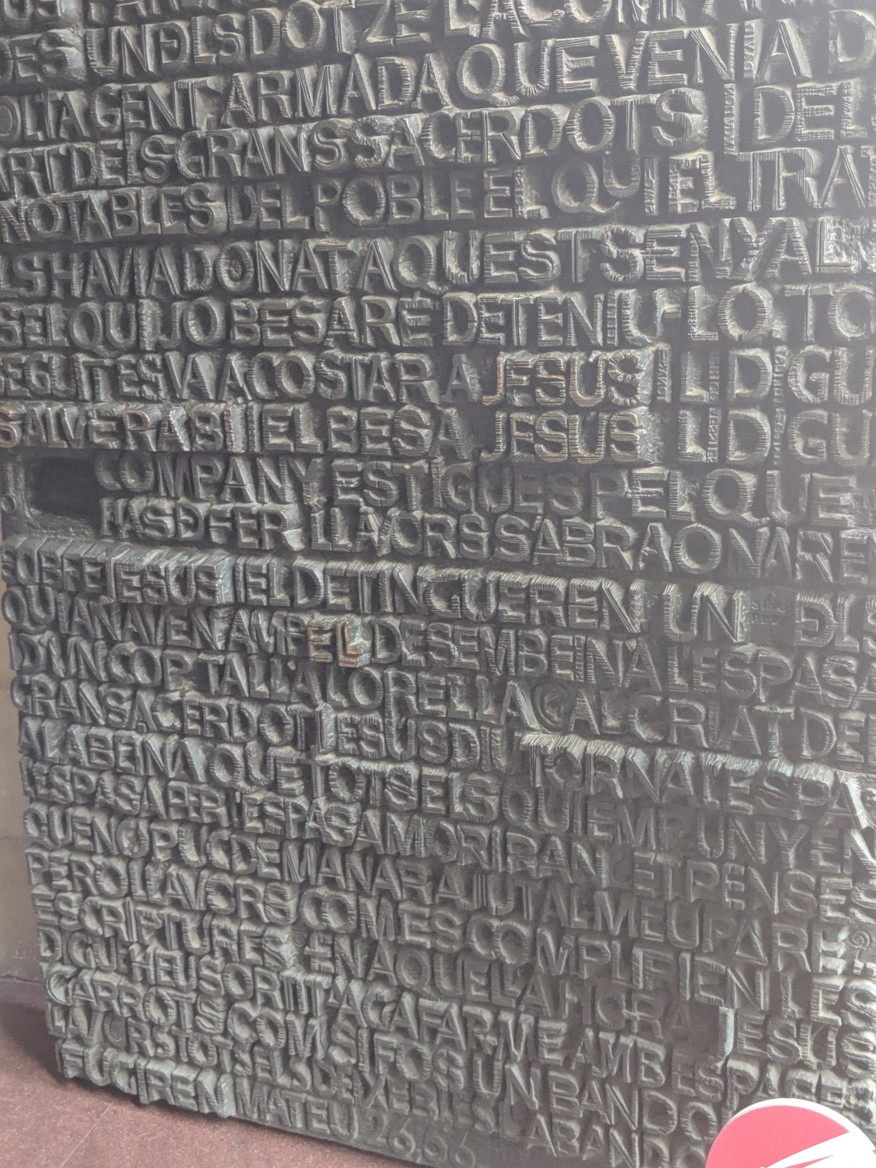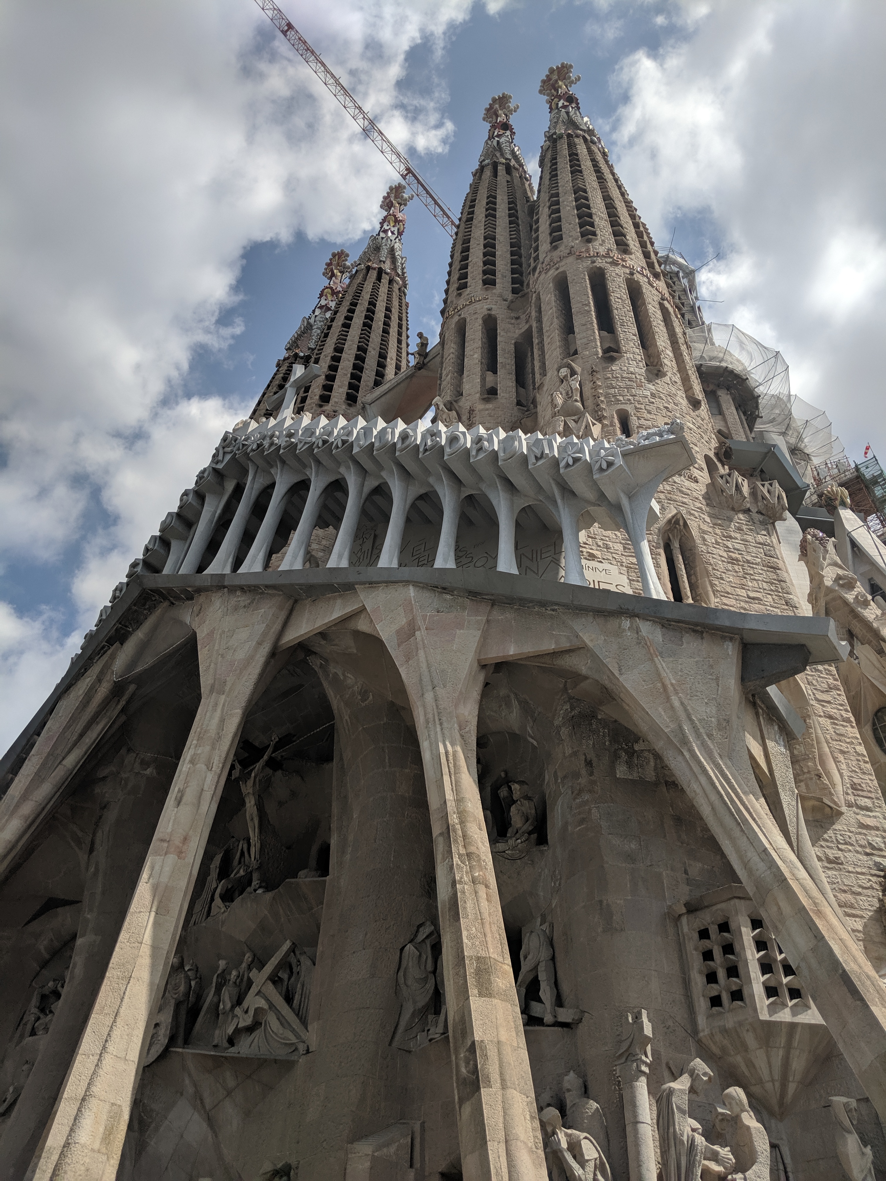 Below, you will see many pictures of the exterior. I won’t go into detail, but there is just so much here. The first picture is of the door on the “Passion” side. The words on the door all relate to the Crucifixion or the Passion of Christ. The second and third pictures show the magnitude of La Sagrada Familia. The last picture on the top row shows the completed parts in gray and the uncompleted parts in yellow. As you can see, there is much to be done before 2026! In the second row, are more exterior pictures including the angels rejoicing the birth, the fruits on top of the spires on the Passion side, another view of the passion side, and a working model of the four main spires that are currently being worked on.