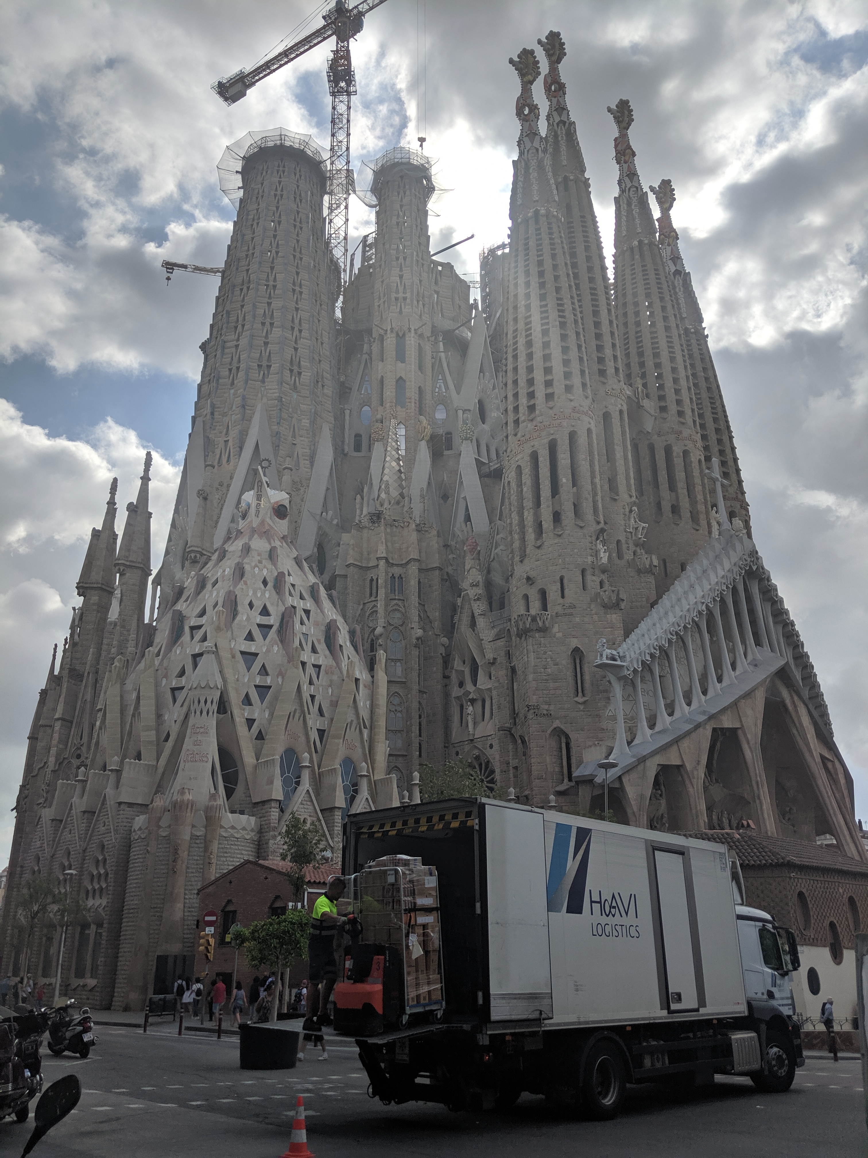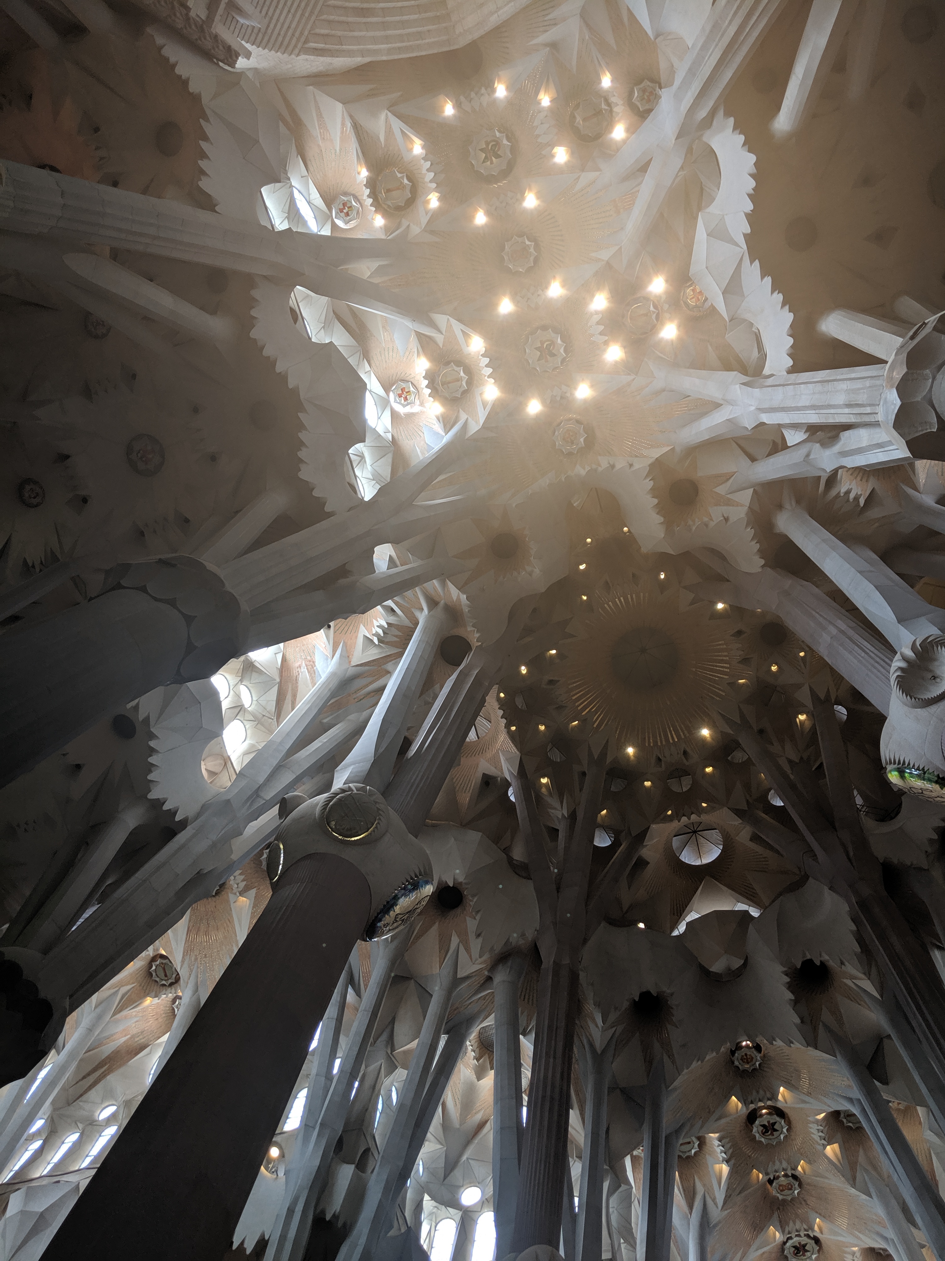 Then we high-tailed it to La Sagrada Familia via Taxi. I did this crazy thing that I deleted all emails of a certain size off of my gmail (so that I would have room for all my pictures on my Google Drive). Well, when I did that I deleted all my tickets that were attached to emails, since they were a larger size. ::head desk:: Luckily, in my 11 page trip itinerary, I have all my confirmation codes, so we were able to look up our tickets based on that. Which is a double good thing, because the tickets to even enter the basilica were completely sold out for the day when we arrived at 10:00am. Anyway, La Sagrada Familia is one of the most beautiful buildings I have ever seen. It is known for its gothic architecture, which I always think of as dark and dreary. But I was wrong. La Sagrada Familia was inspired by Catalan (region where Barcelona sits within spain (Catalonia)) Architect Antoni Gaudi. Construction was started in 1882 and Gaudi took over in 1883 when there was an artistic difference between the architect and funder. This is an unfinished building, and the expected finished is in 2026.