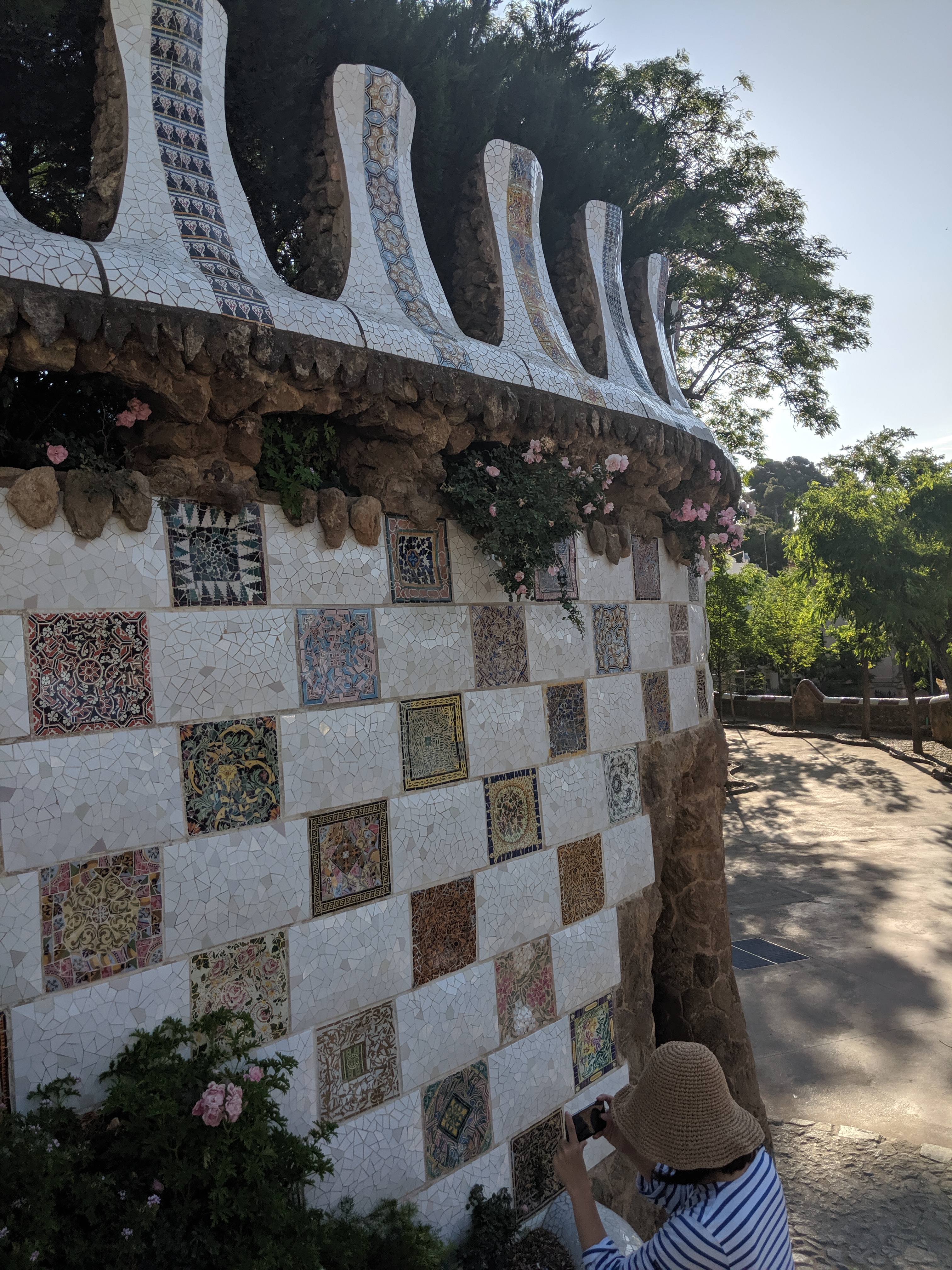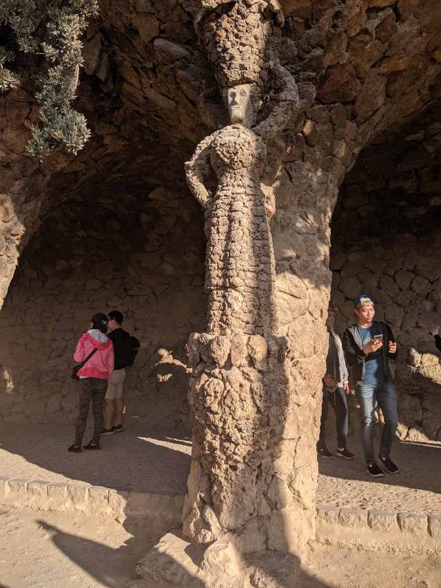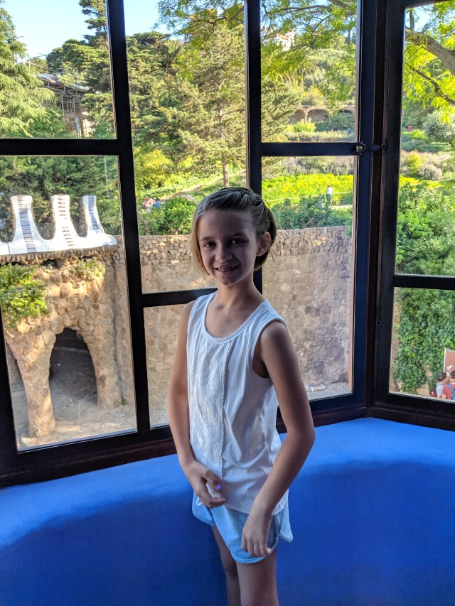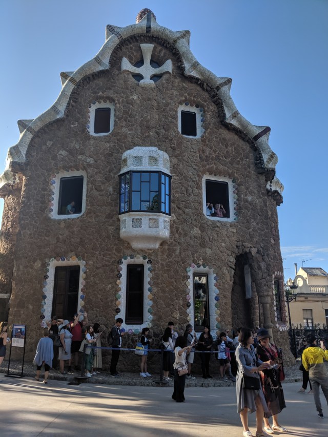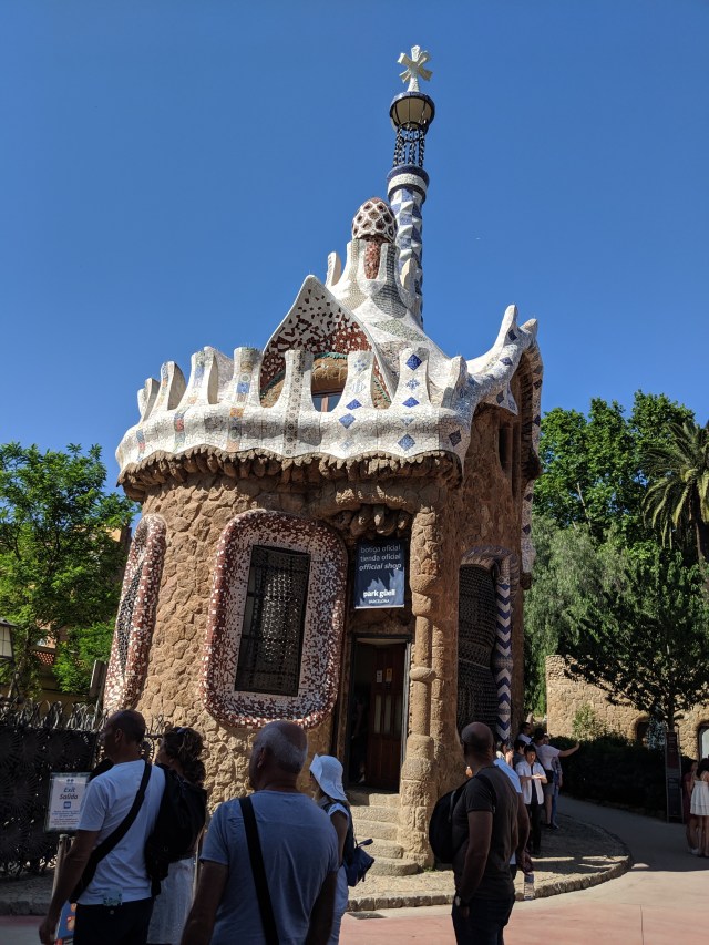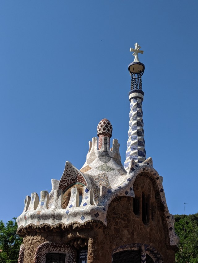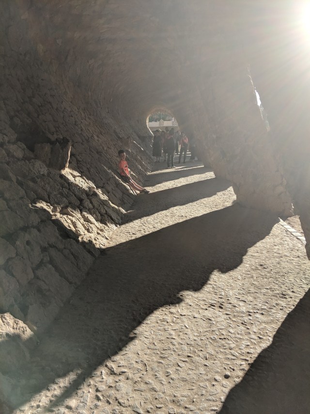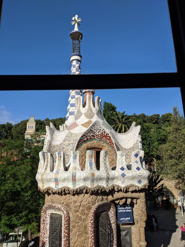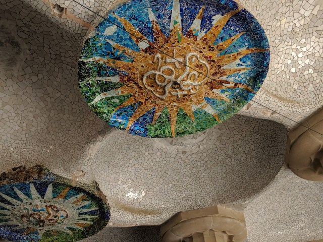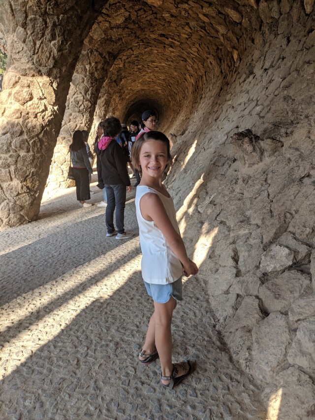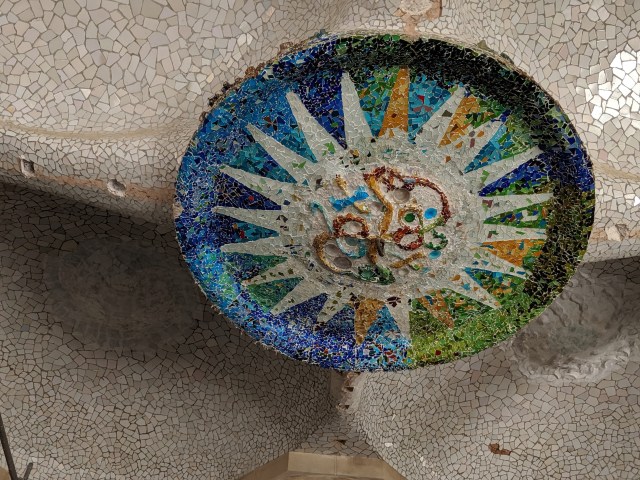 We got up bright and early on our last day in Barcelona. We headed to Park Guell. Antoni Gaudi was hired by Mr. Guell to design a utopian community for the wealthy of Barcelona in the late 1800’s. However, construction halted after some of the community was built. Eventually (not sure on the timeline) the city made it into a public park. Gaudi loved to make curved surfaces and broke tile into small pieces to make mosaics to acheive the curved look. In these pictures, you will see the stairs (and famous lizard) leading up to the square, an open square with a mosaic bench over looking Barcelona, the Porter’s quarters, Gaudi’s house on site, lower level walkway, overhead mosaics and gardens in the park. The mosaics are absolutely beautiful.