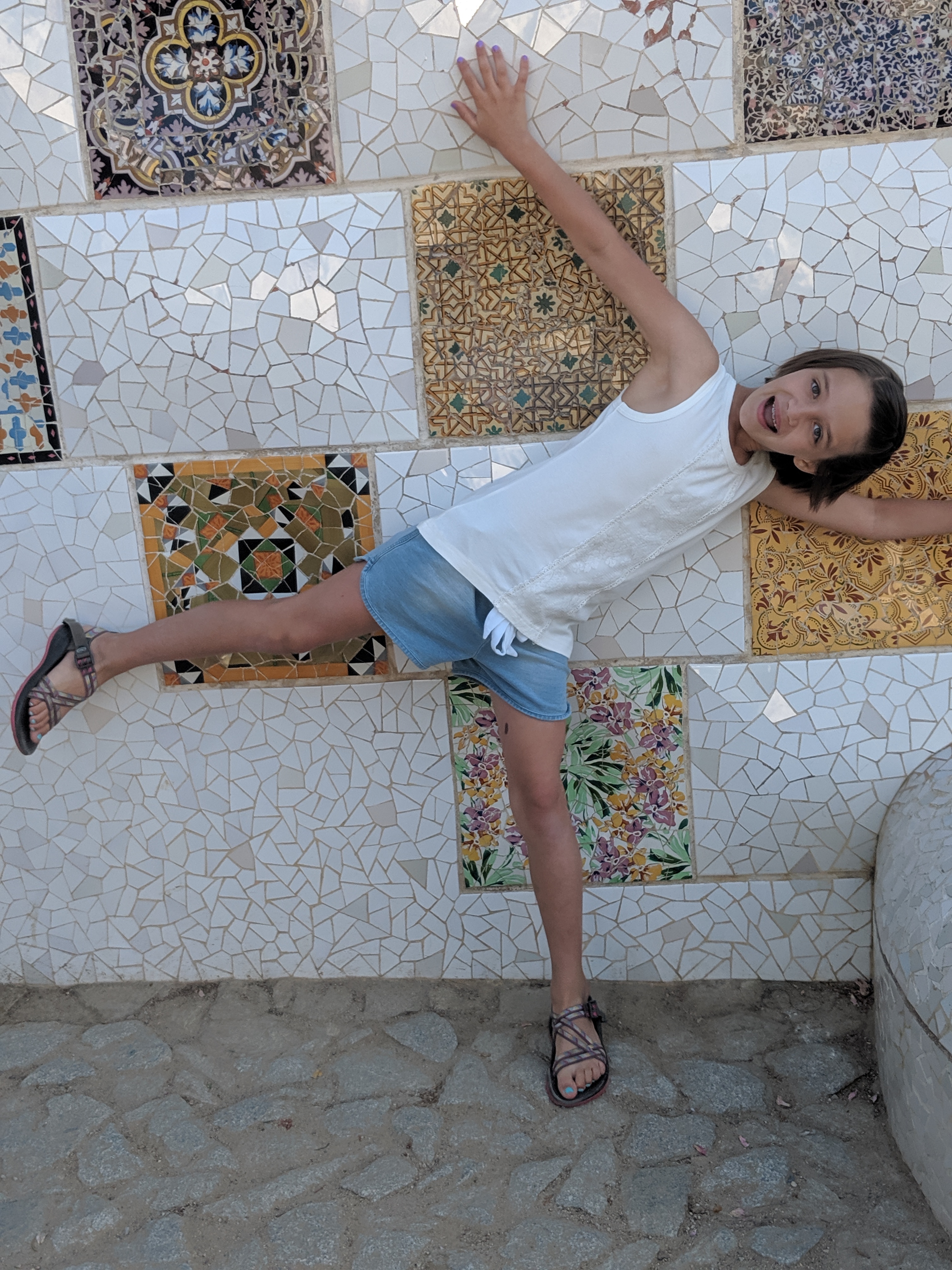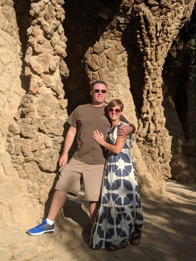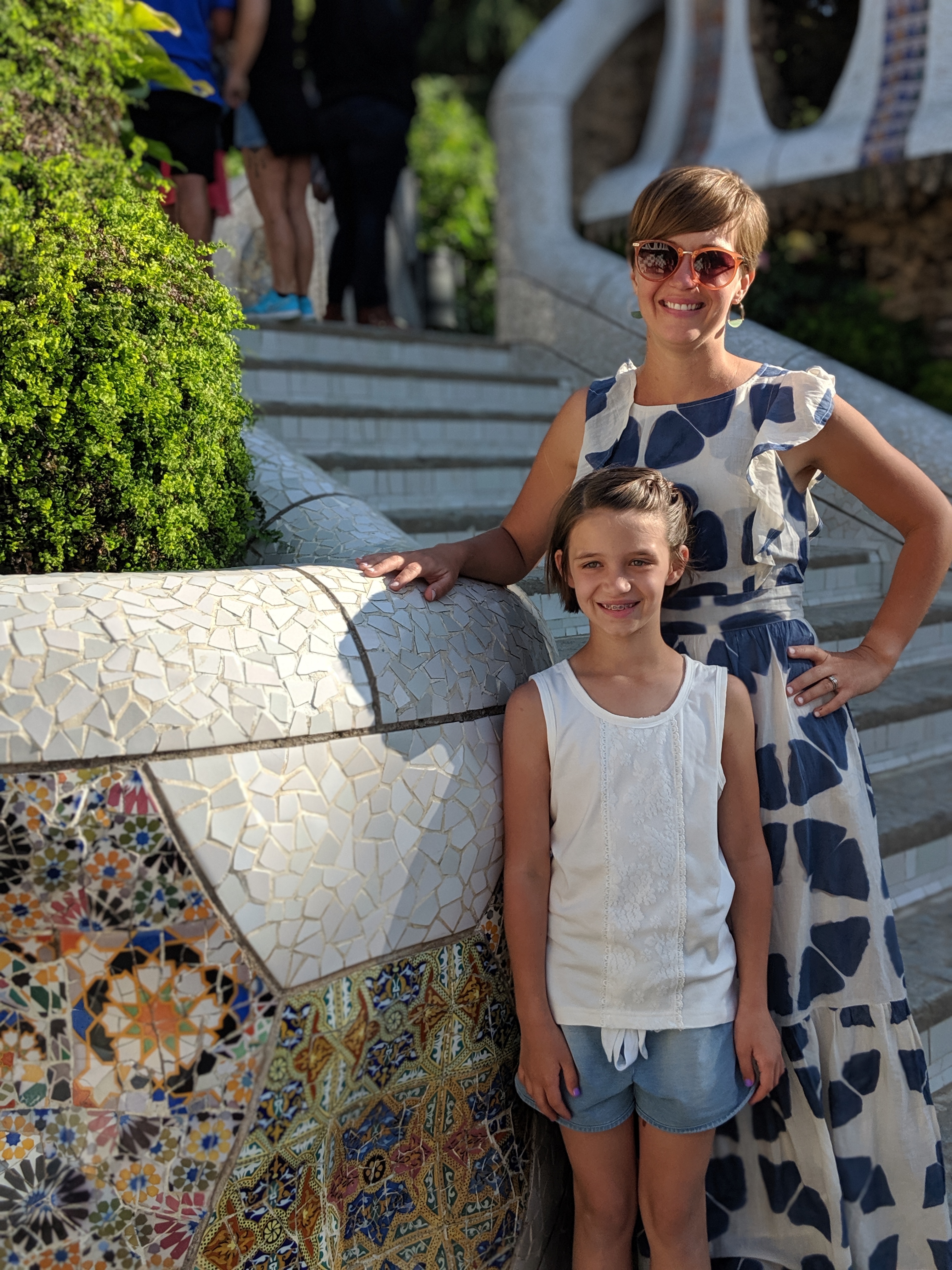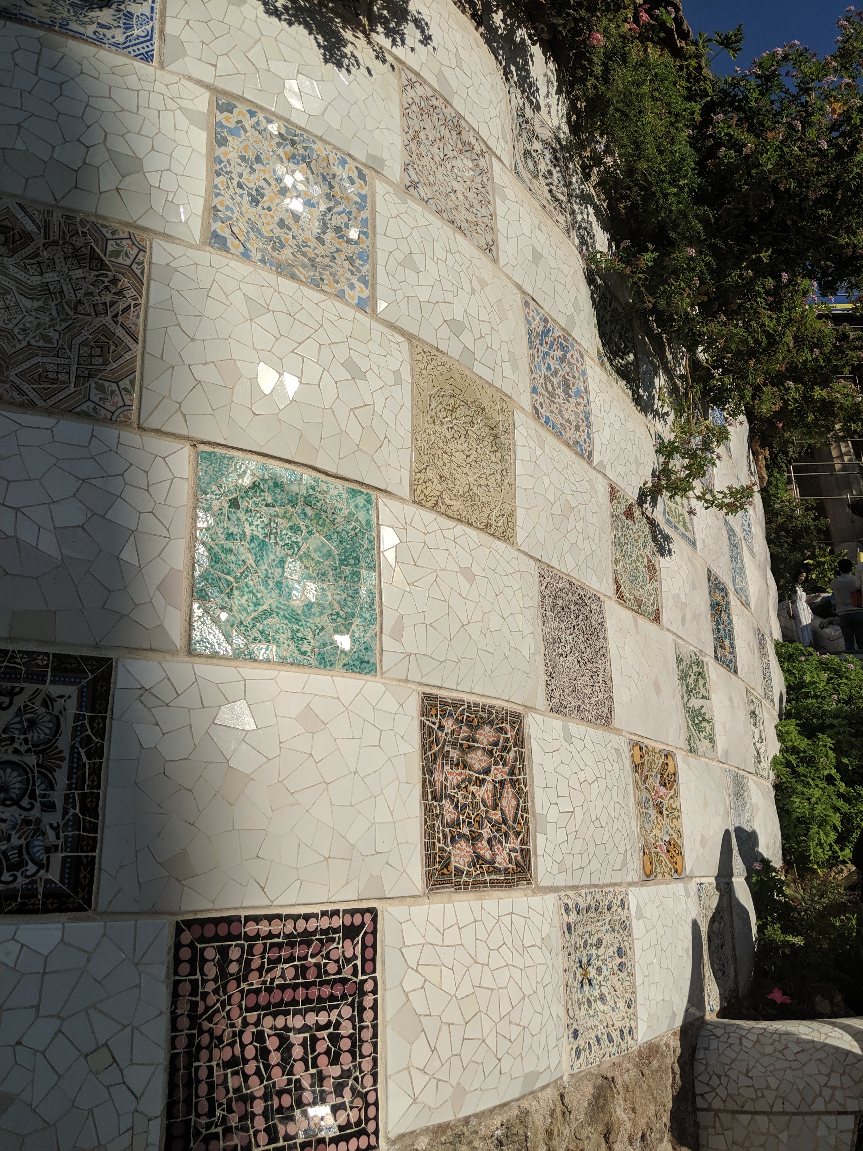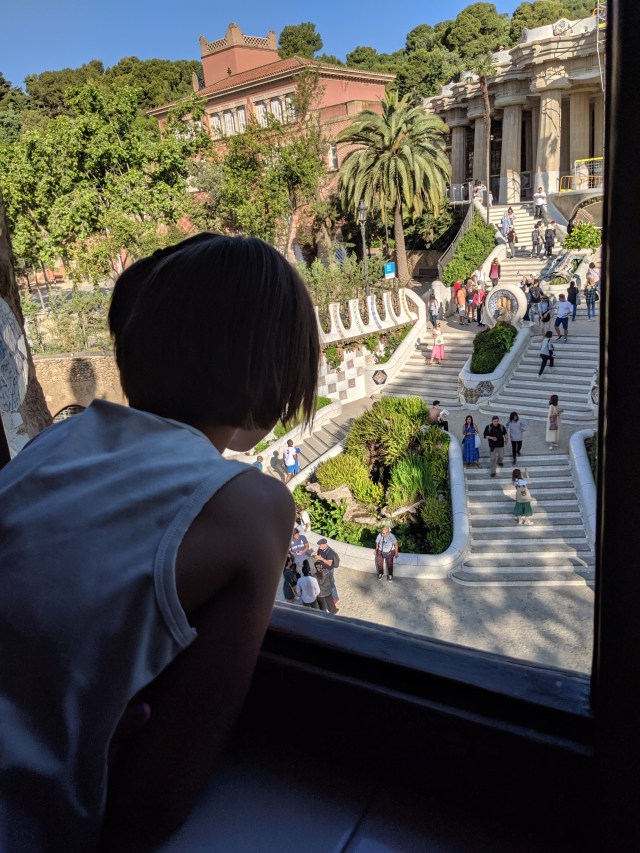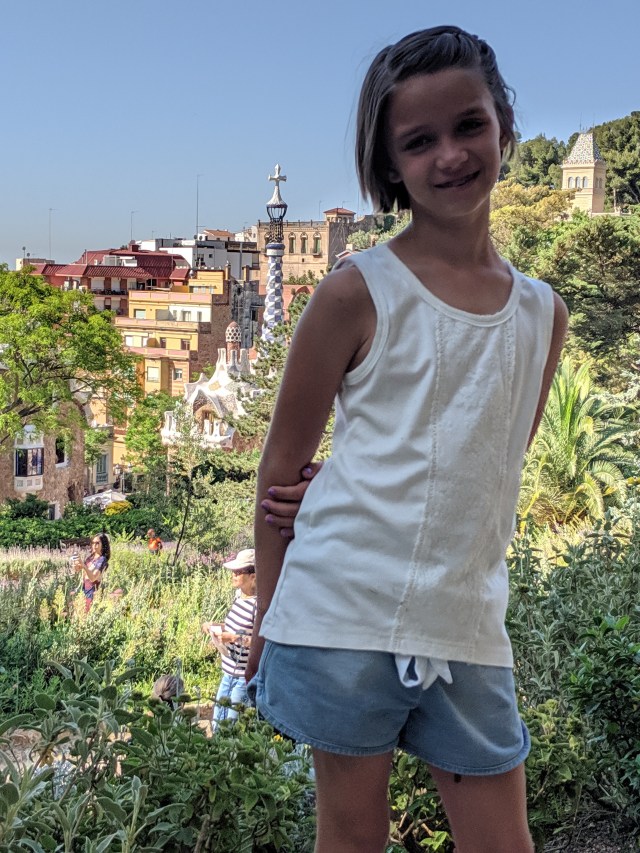 We got up bright and early on our last day in Barcelona. We headed to Park Guell. Antoni Gaudi was hired by Mr. Guell to design a utopian community for the wealthy of Barcelona in the late 1800’s. However, construction halted after some of the community was built. Eventually (not sure on the timeline) the city made it into a public park. Gaudi loved to make curved surfaces and broke tile into small pieces to make mosaics to acheive the curved look. In these pictures, you will see the stairs (and famous lizard) leading up to the square, an open square with a mosaic bench over looking Barcelona, the Porter’s quarters, Gaudi’s house on site, lower level walkway, overhead mosaics and gardens in the park. The mosaics are absolutely beautiful.
