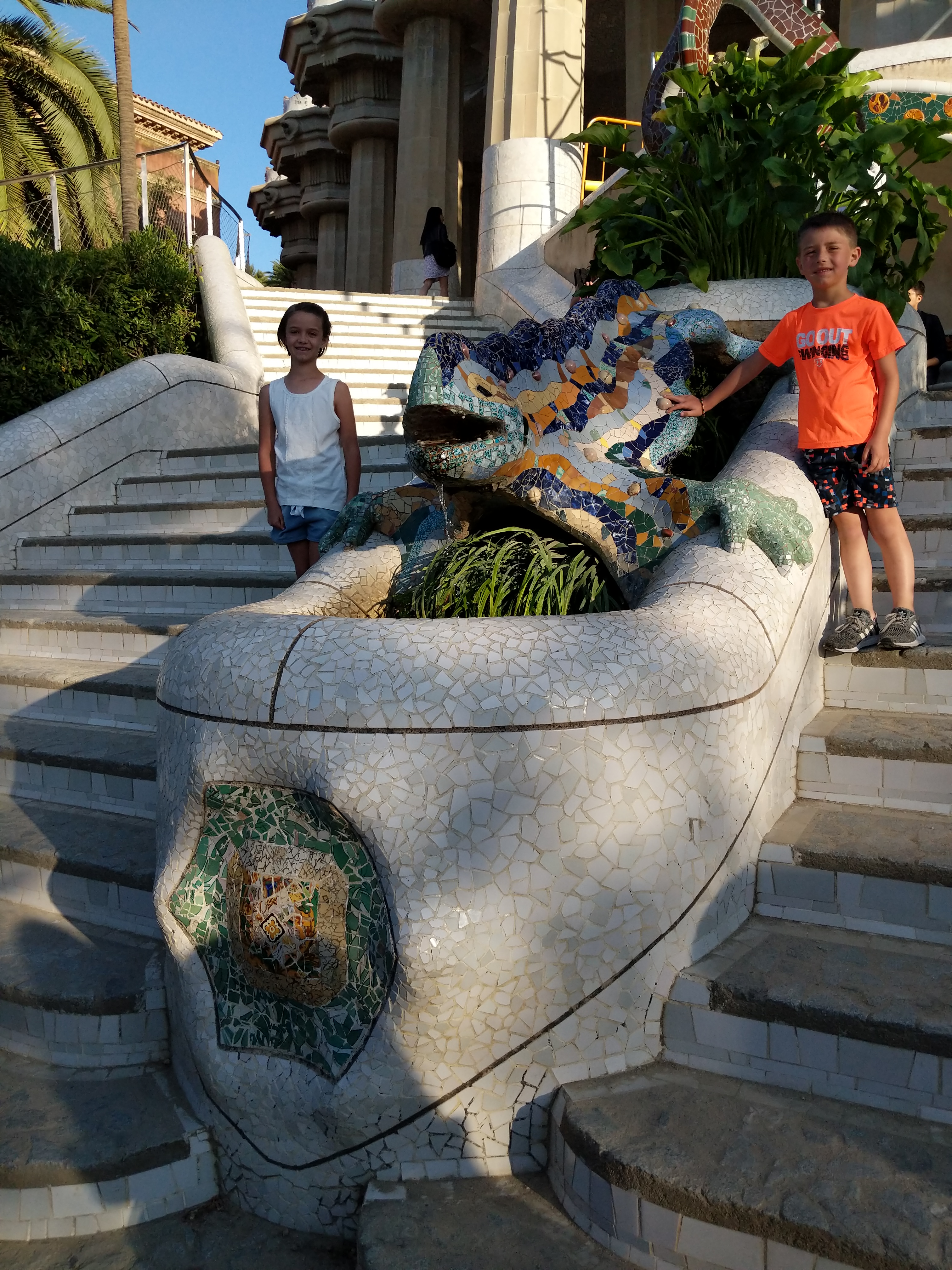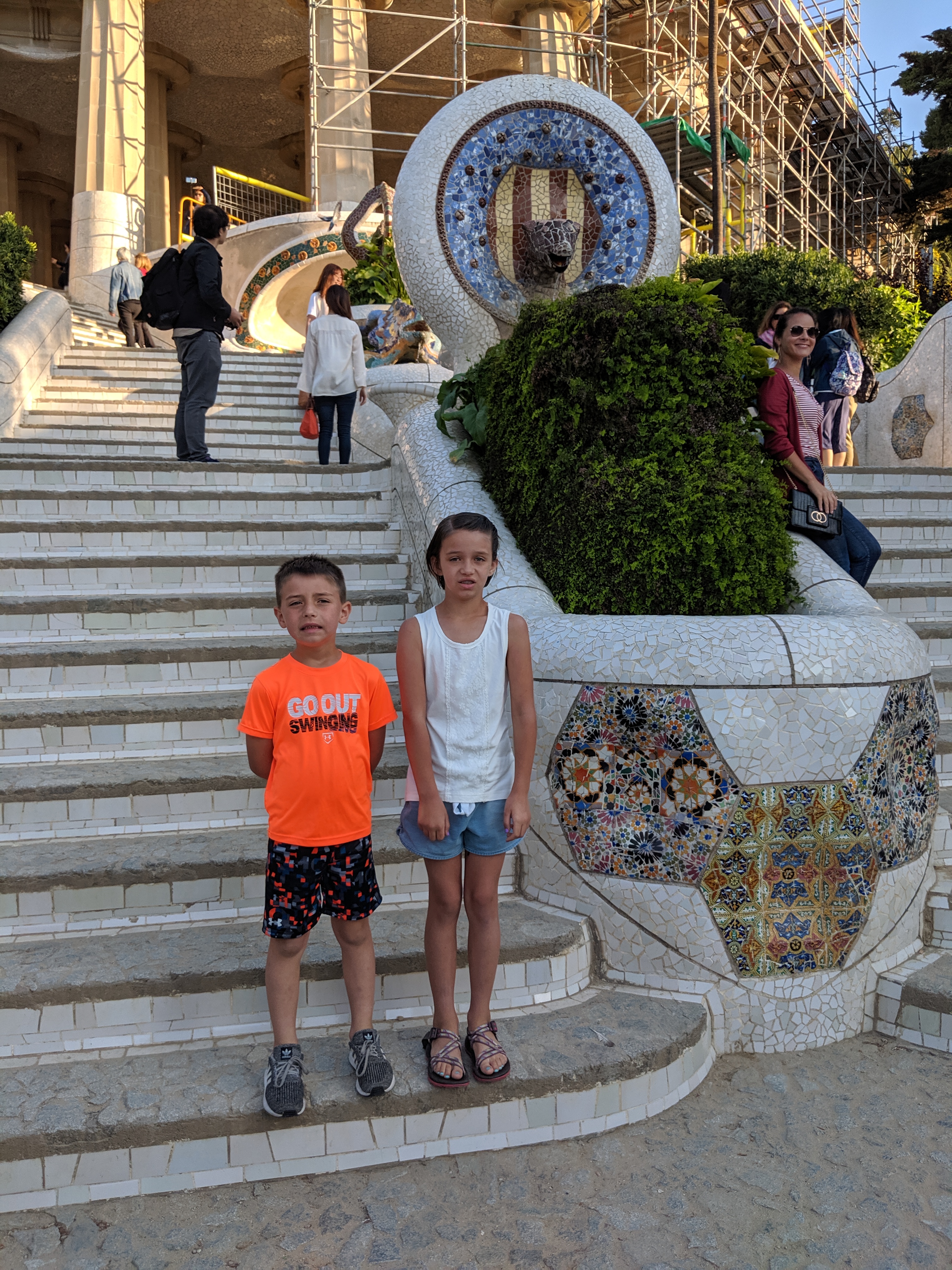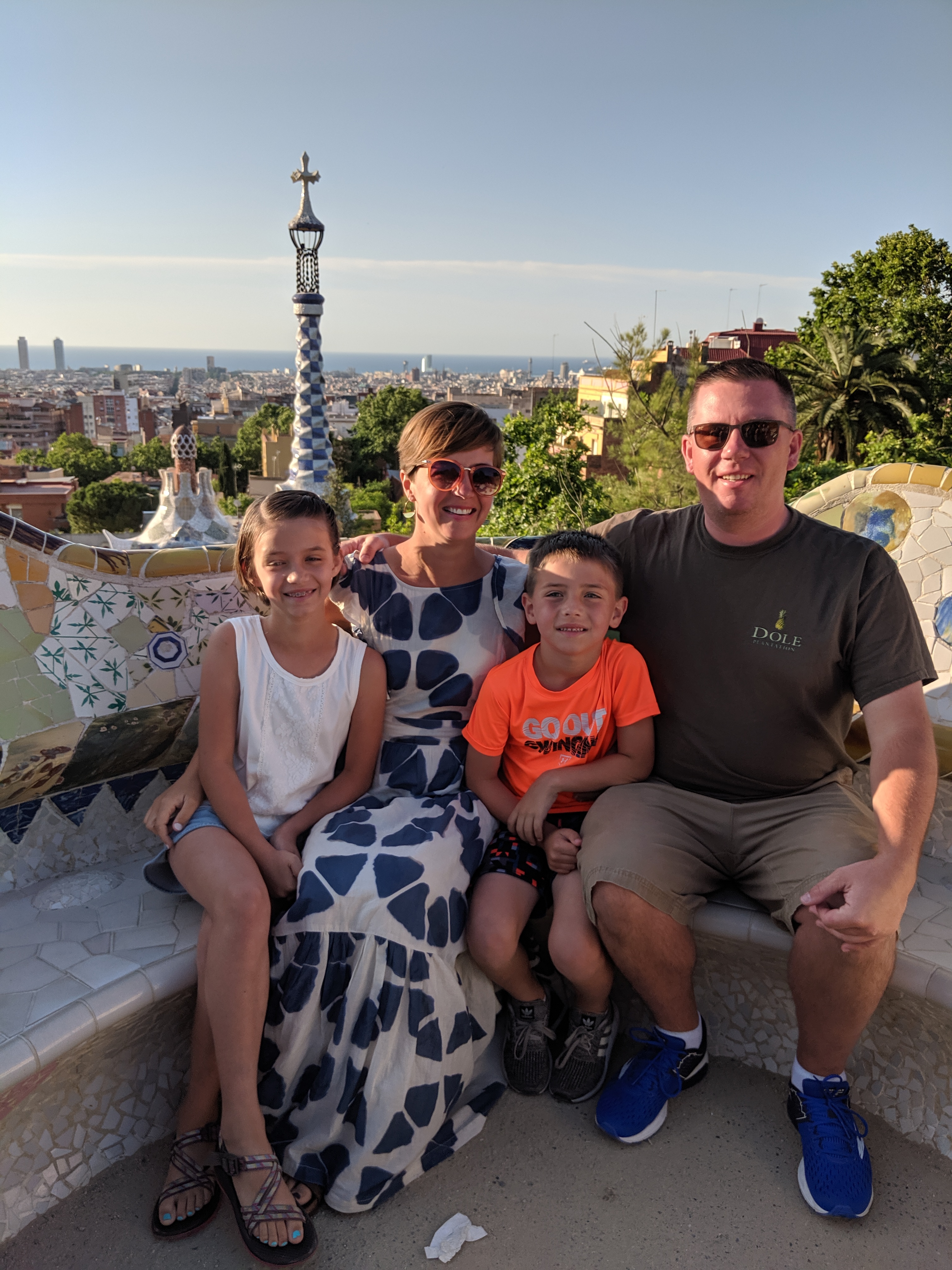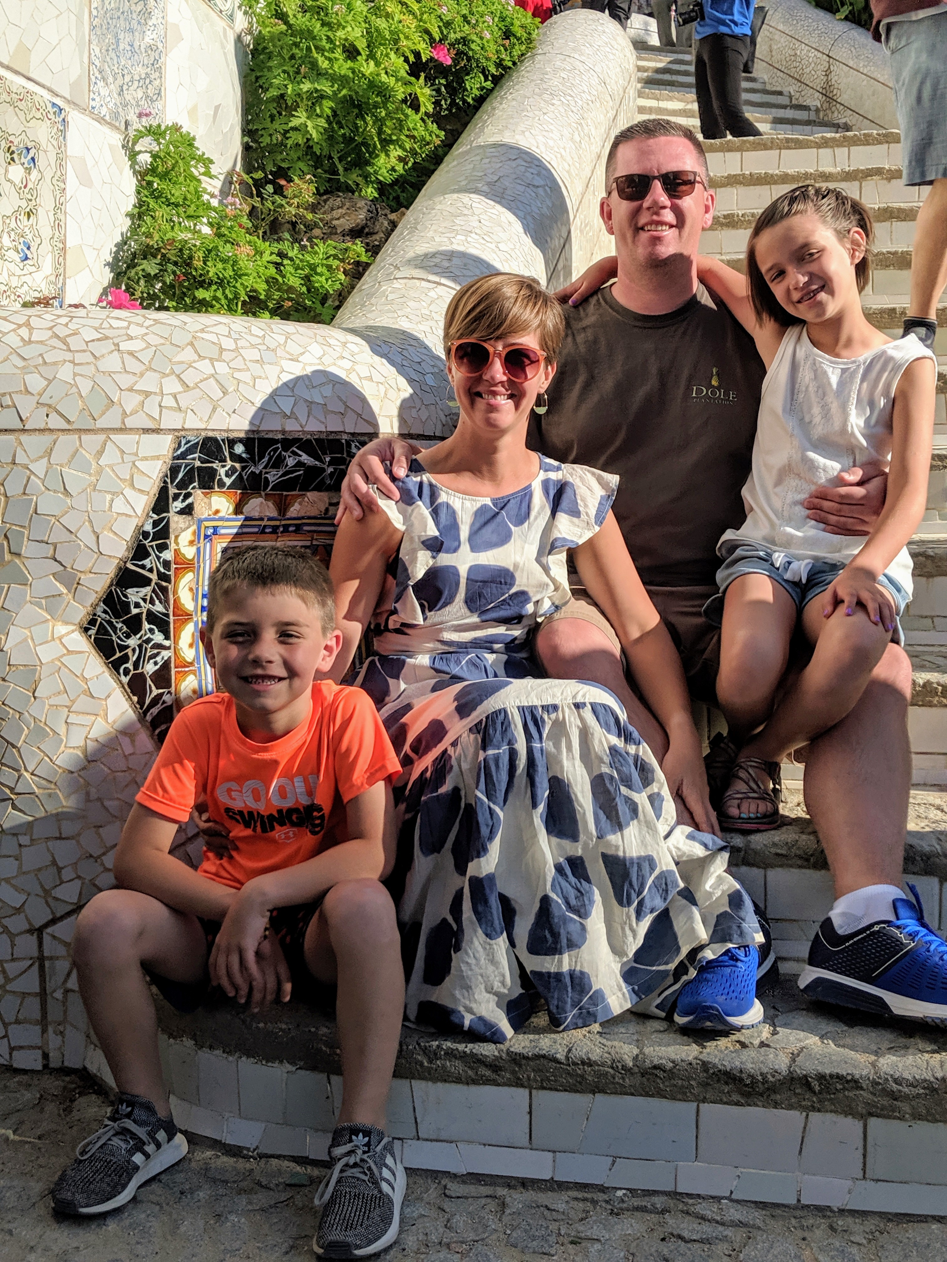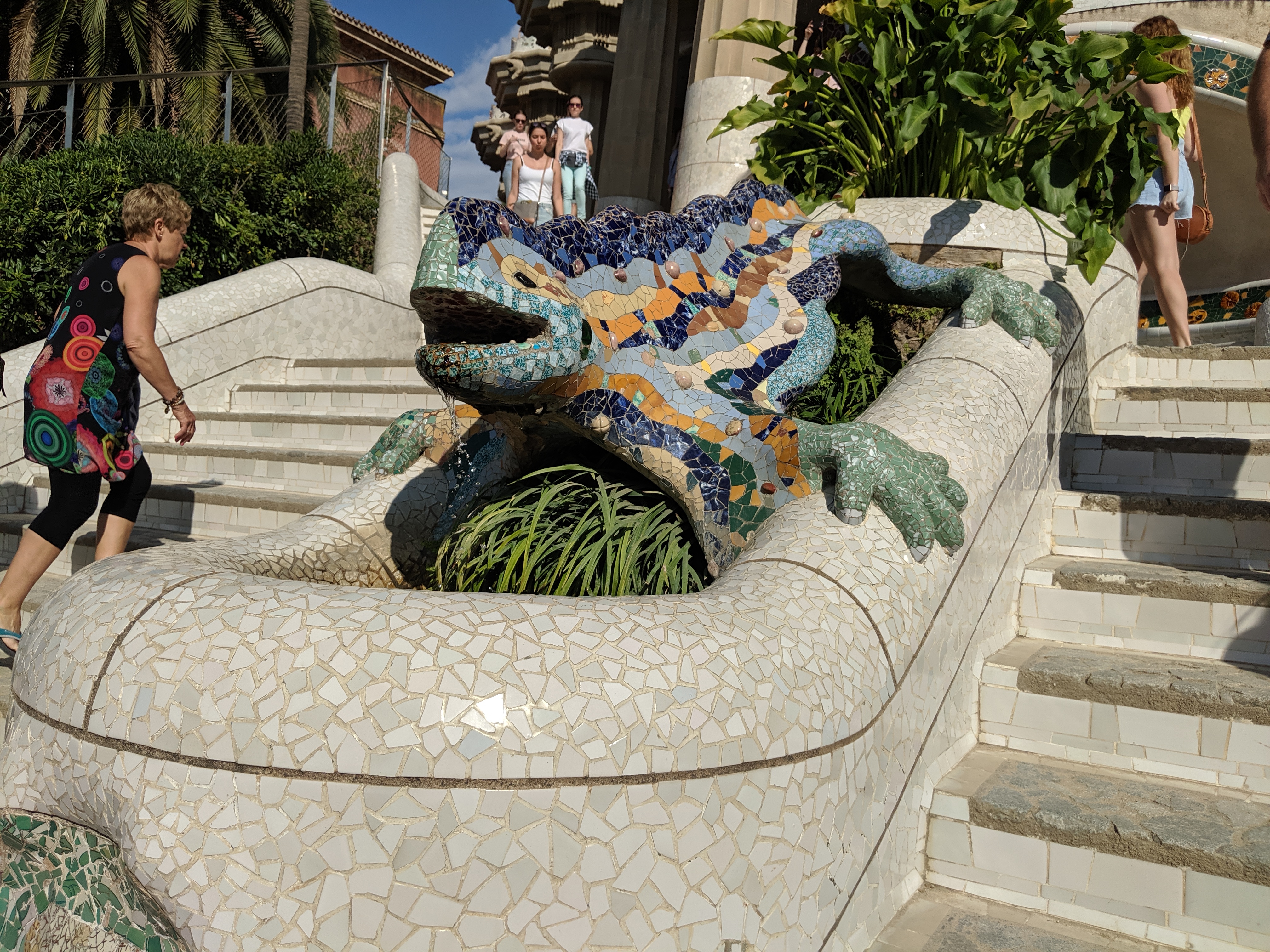 We got up bright and early on our last day in Barcelona. We headed to Park Guell. Antoni Gaudi was hired by Mr. Guell to design a utopian community for the wealthy of Barcelona in the late 1800’s. However, construction halted after some of the community was built. Eventually (not sure on the timeline) the city made it into a public park. Gaudi loved to make curved surfaces and broke tile into small pieces to make mosaics to acheive the curved look. In these pictures, you will see the stairs (and famous lizard) leading up to the square, an open square with a mosaic bench over looking Barcelona, the Porter’s quarters, Gaudi’s house on site, lower level walkway, overhead mosaics and gardens in the park. The mosaics are absolutely beautiful.