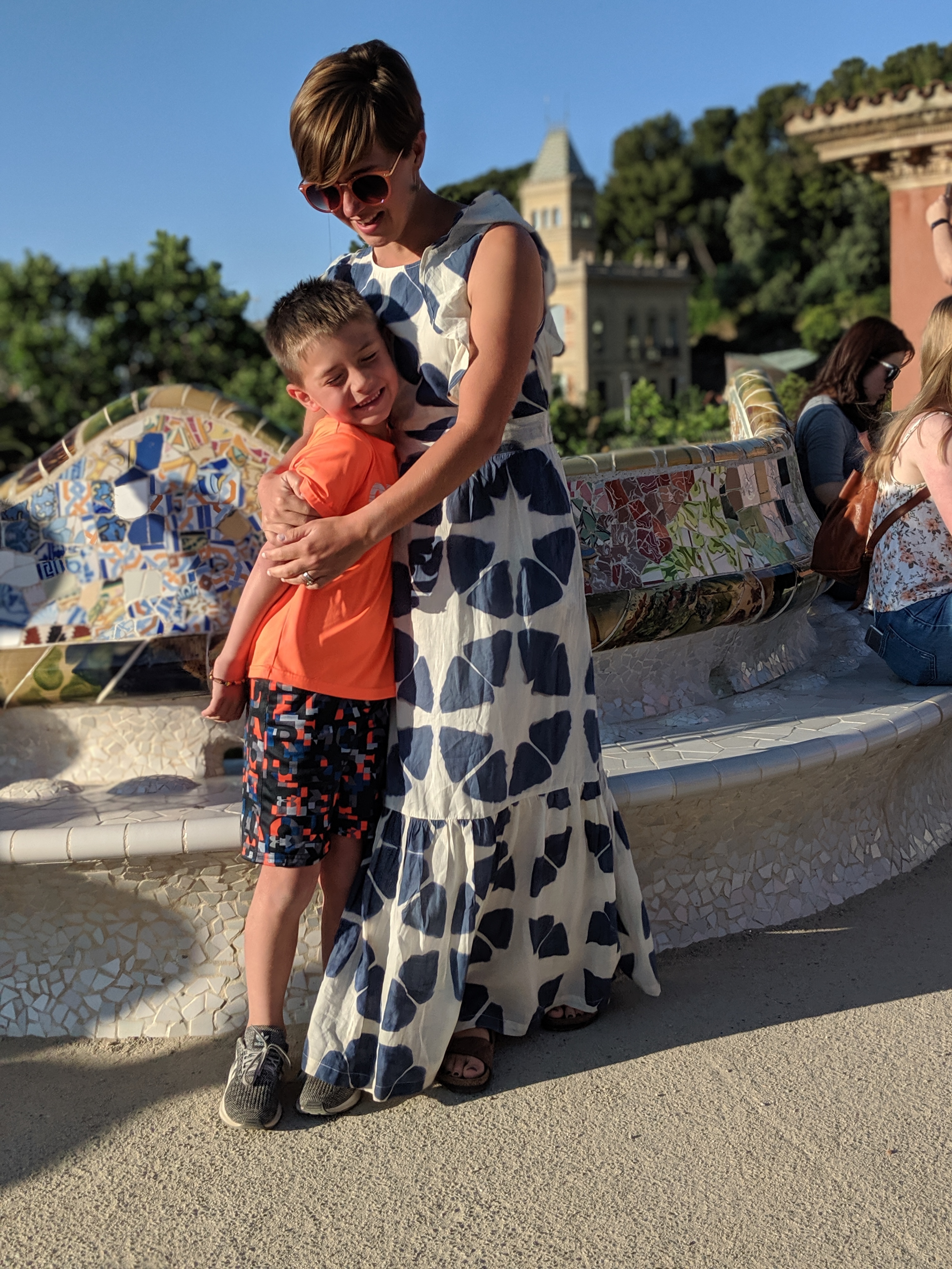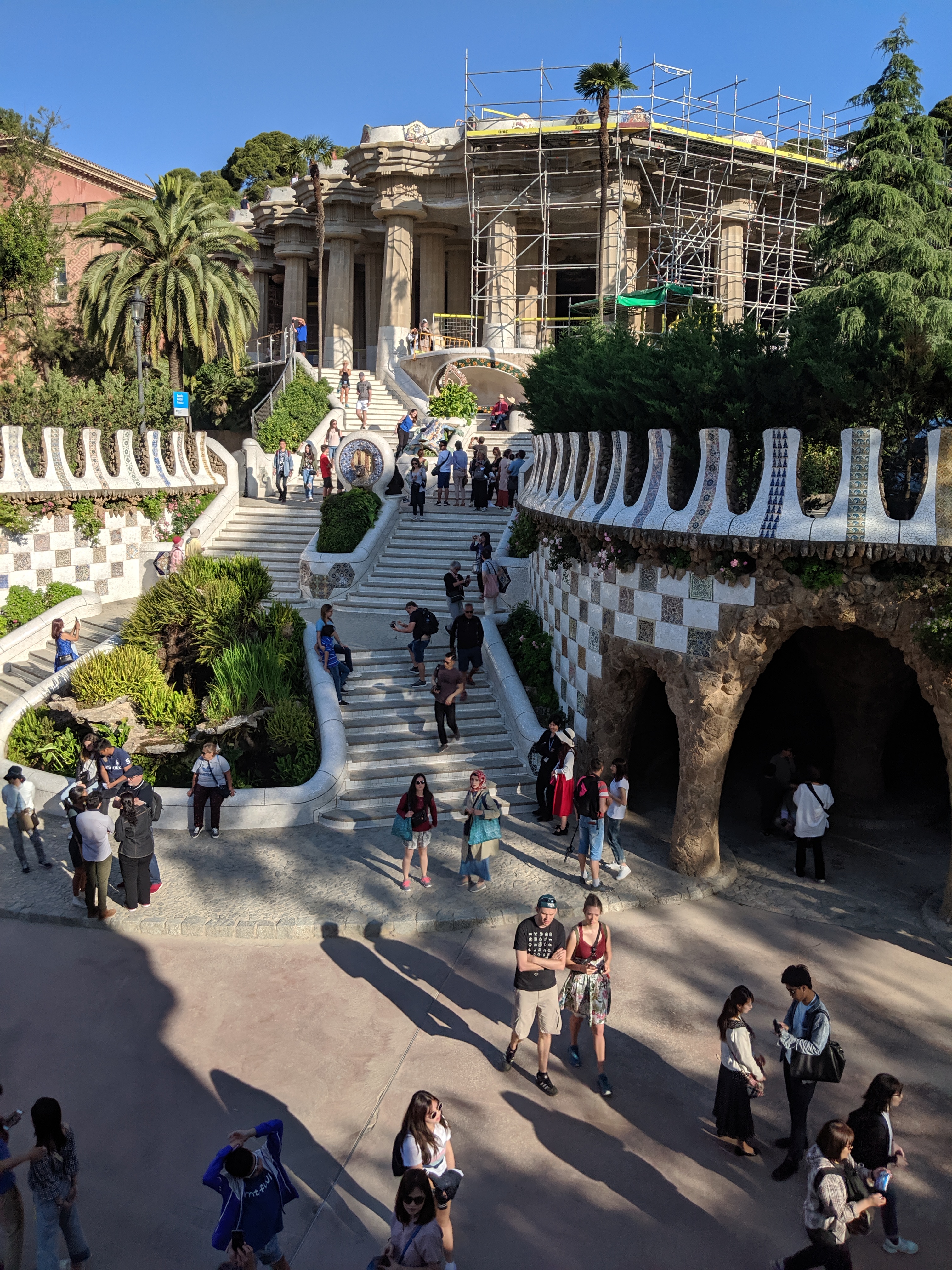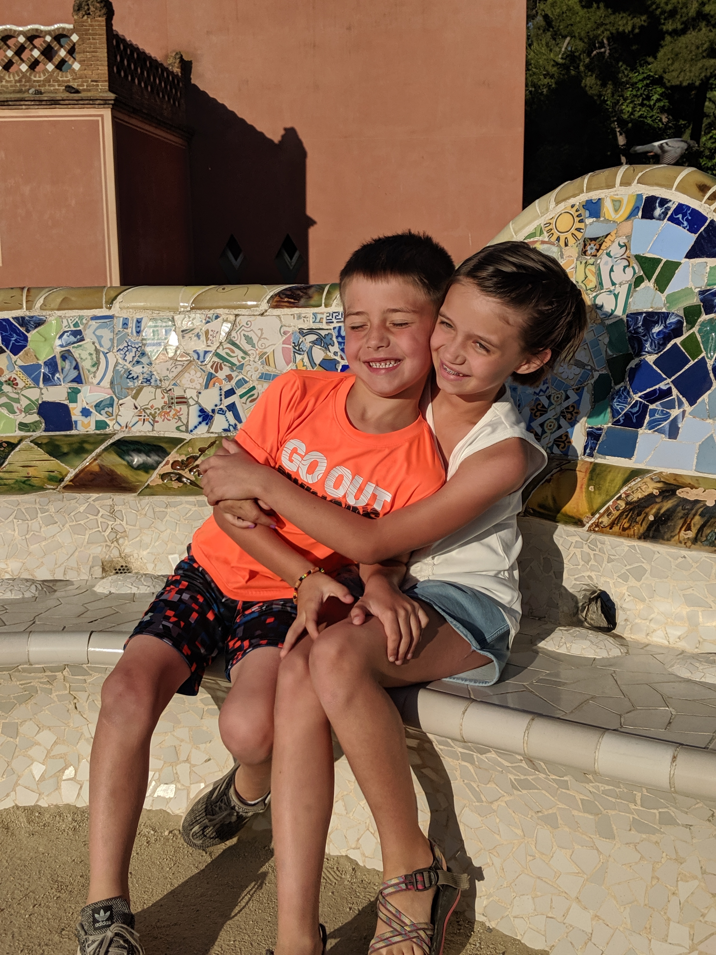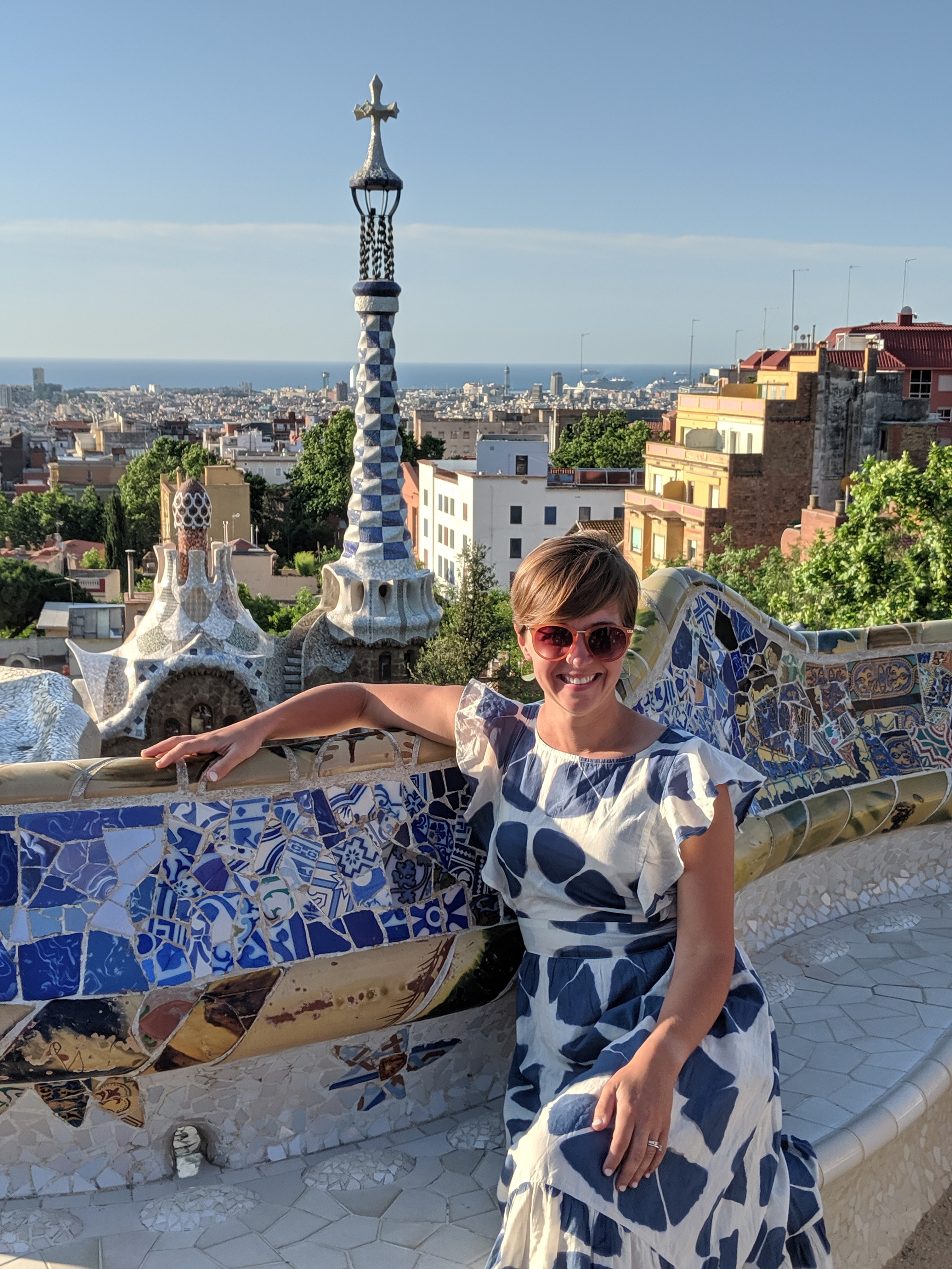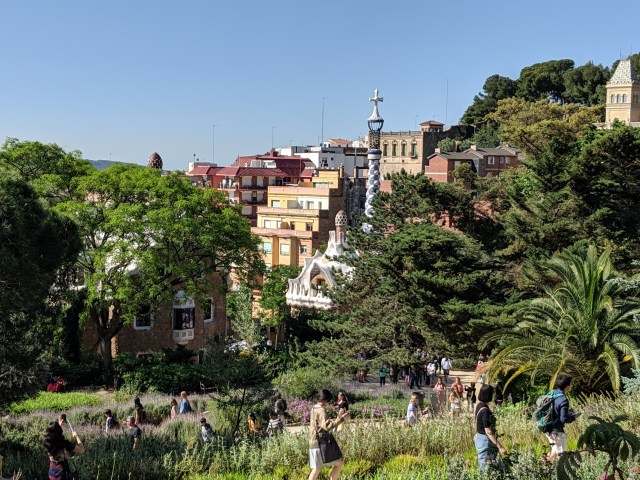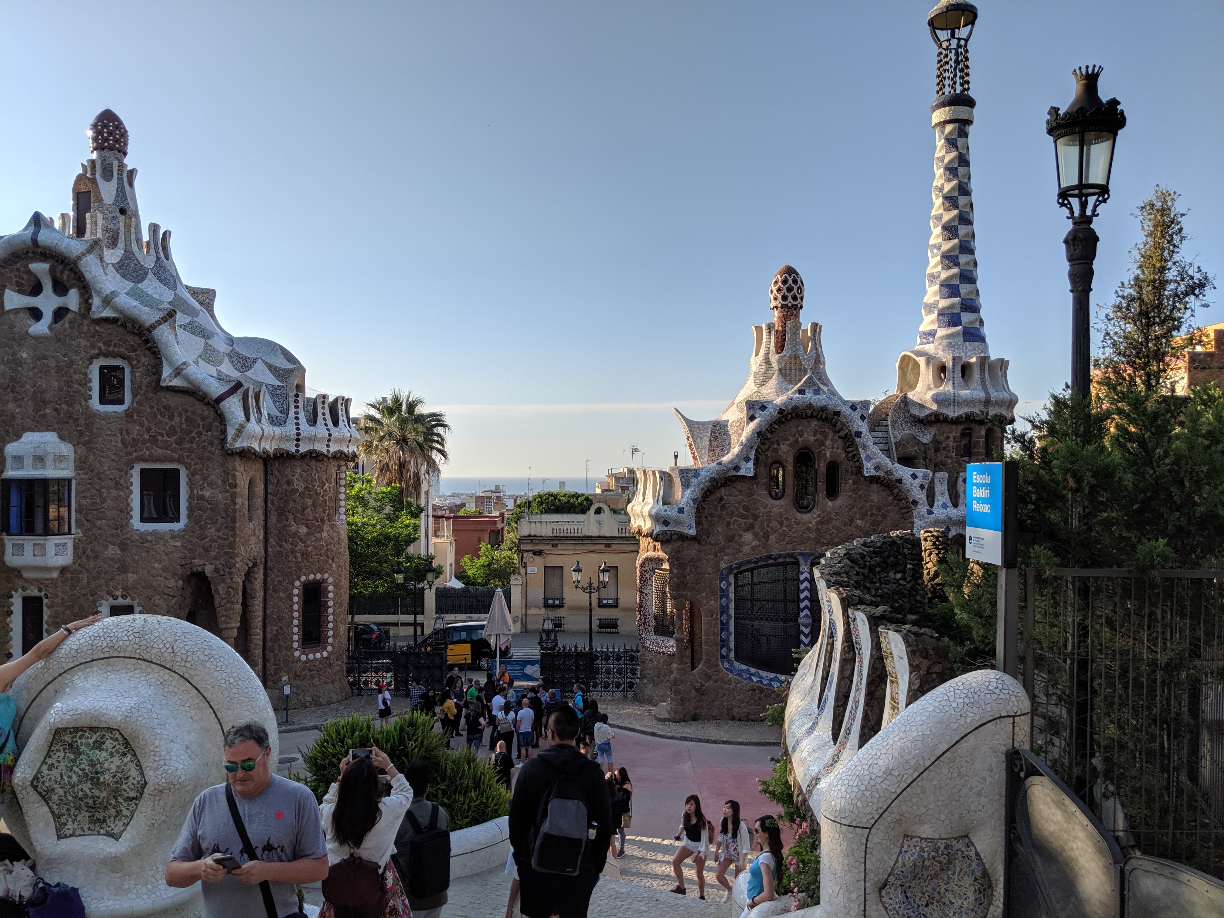 We got up bright and early on our last day in Barcelona. We headed to Park Guell. Antoni Gaudi was hired by Mr. Guell to design a utopian community for the wealthy of Barcelona in the late 1800’s. However, construction halted after some of the community was built. Eventually (not sure on the timeline) the city made it into a public park. Gaudi loved to make curved surfaces and broke tile into small pieces to make mosaics to acheive the curved look. In these pictures, you will see the stairs (and famous lizard) leading up to the square, an open square with a mosaic bench over looking Barcelona, the Porter’s quarters, Gaudi’s house on site, lower level walkway, overhead mosaics and gardens in the park. The mosaics are absolutely beautiful.
