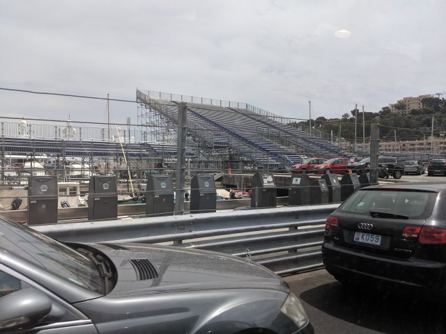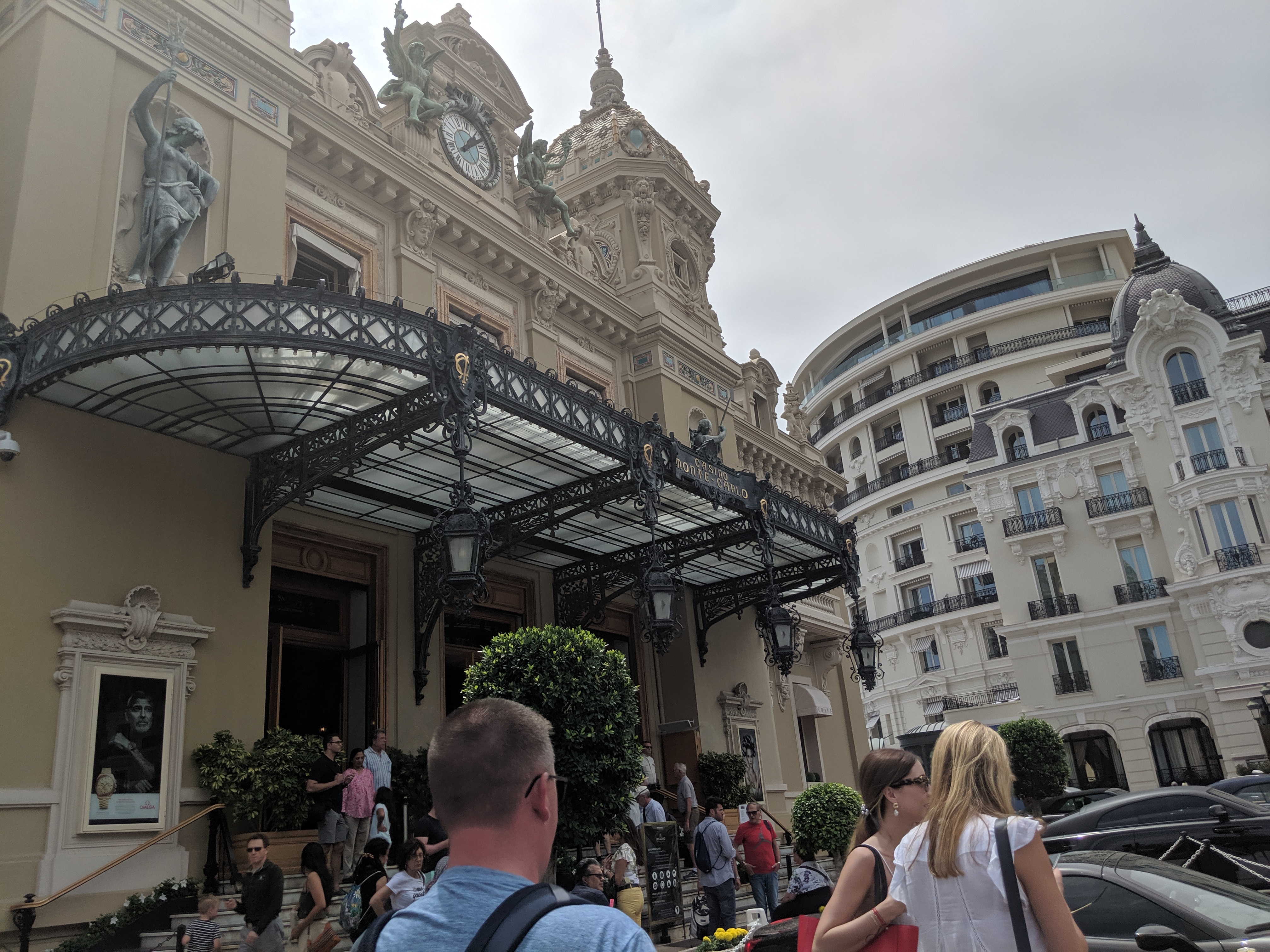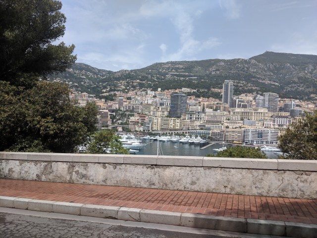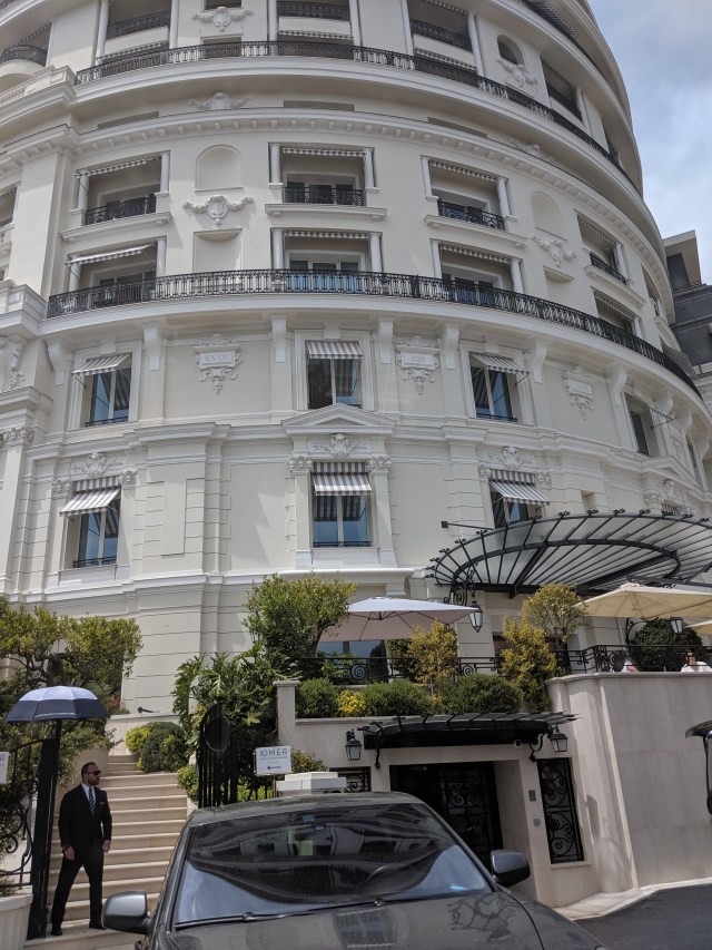 Next, we took the route of the Formula 1 Grand Prix to the Monte Carlo Casino and saw the beautiful (and well-known) Hotel de Paris. This was definitely an area for the extremely wealthy. We went into the Casino lobby and there were a few (American) machines so we each played a few dollars to say we did it. To go further into the Casino required a strict dress code and it didn’t open until after 2pm. We headed out in more the Grand Prix route. The race was very recent (last week, I believe) so some of the bleachers we’re still in place.