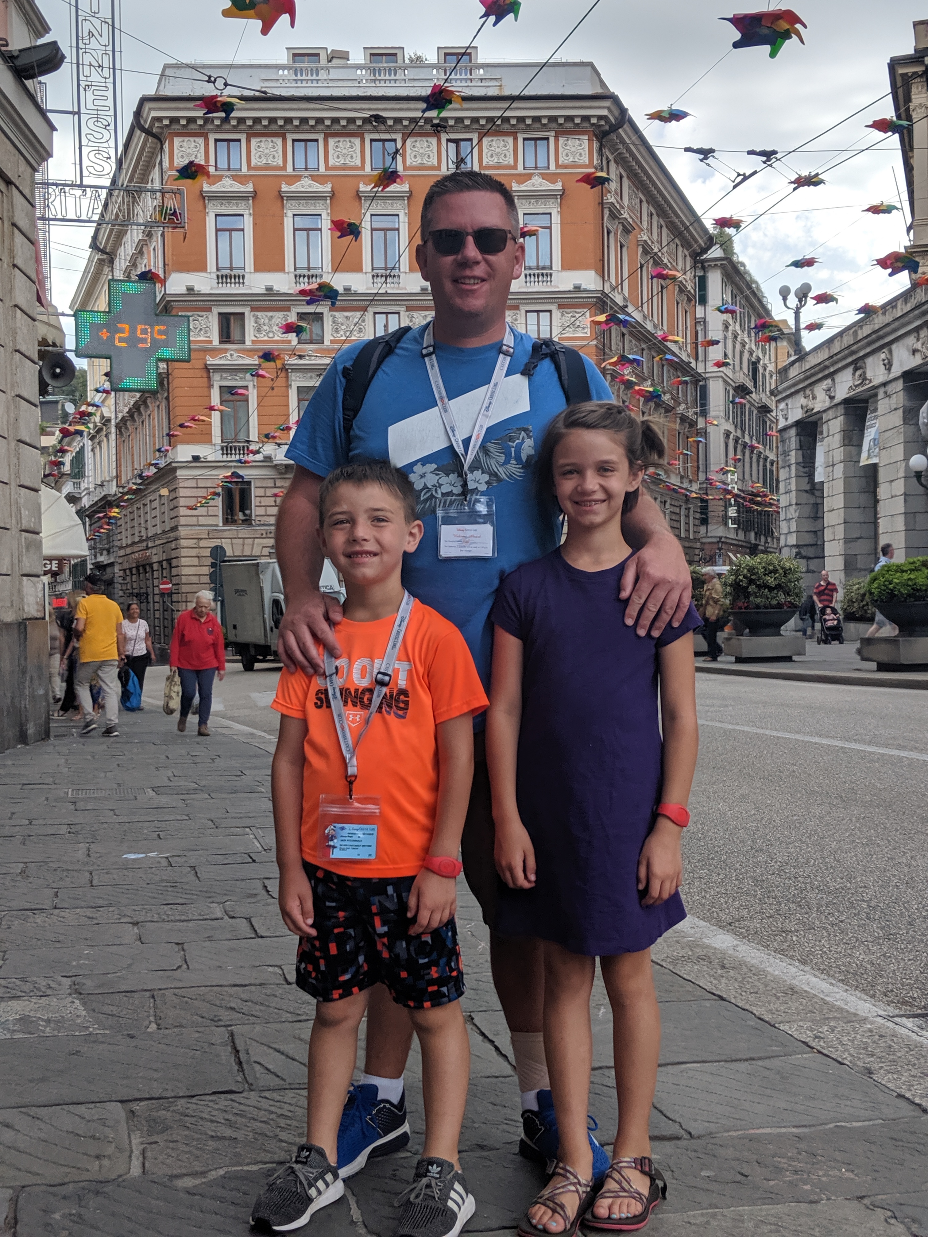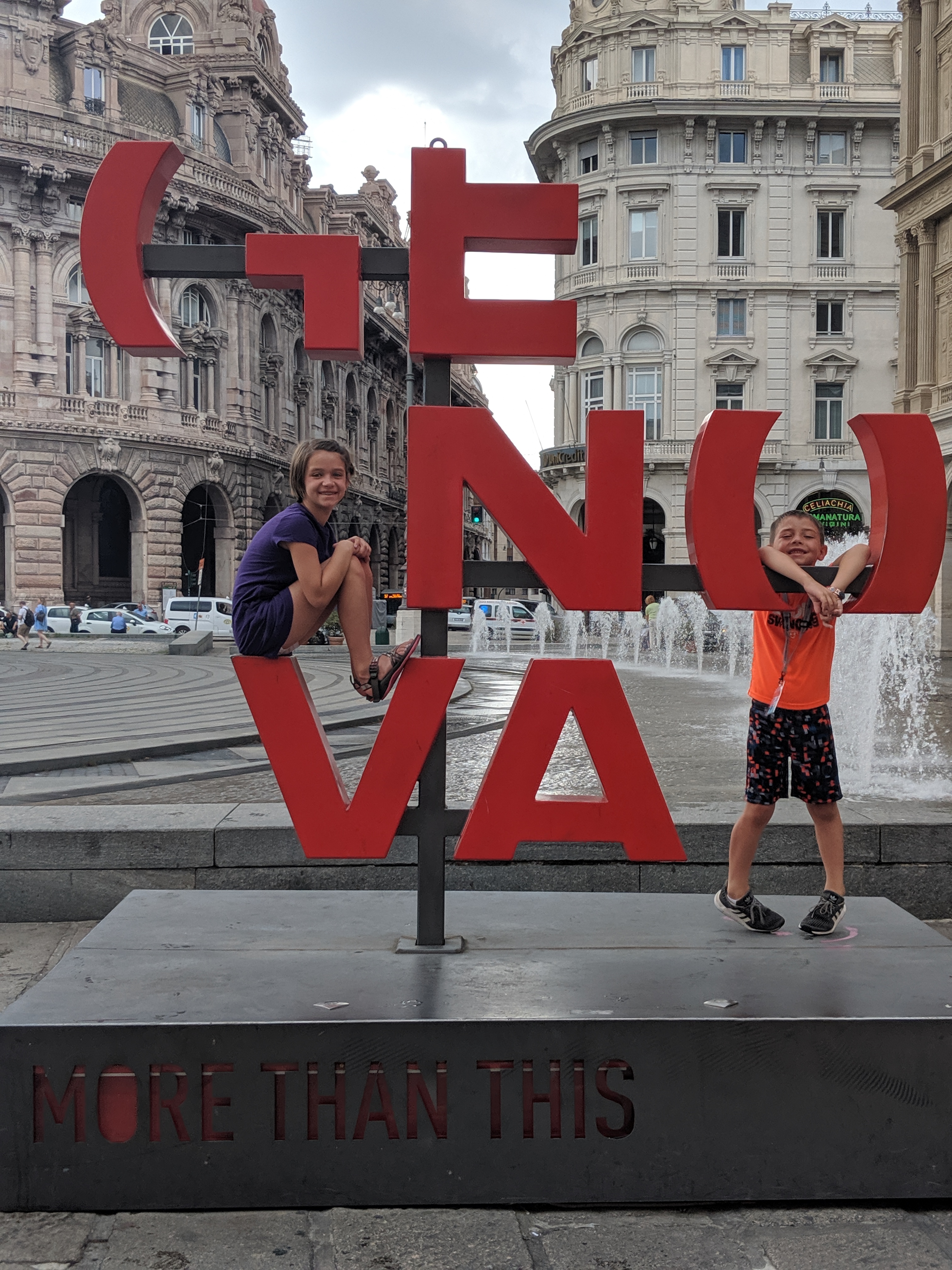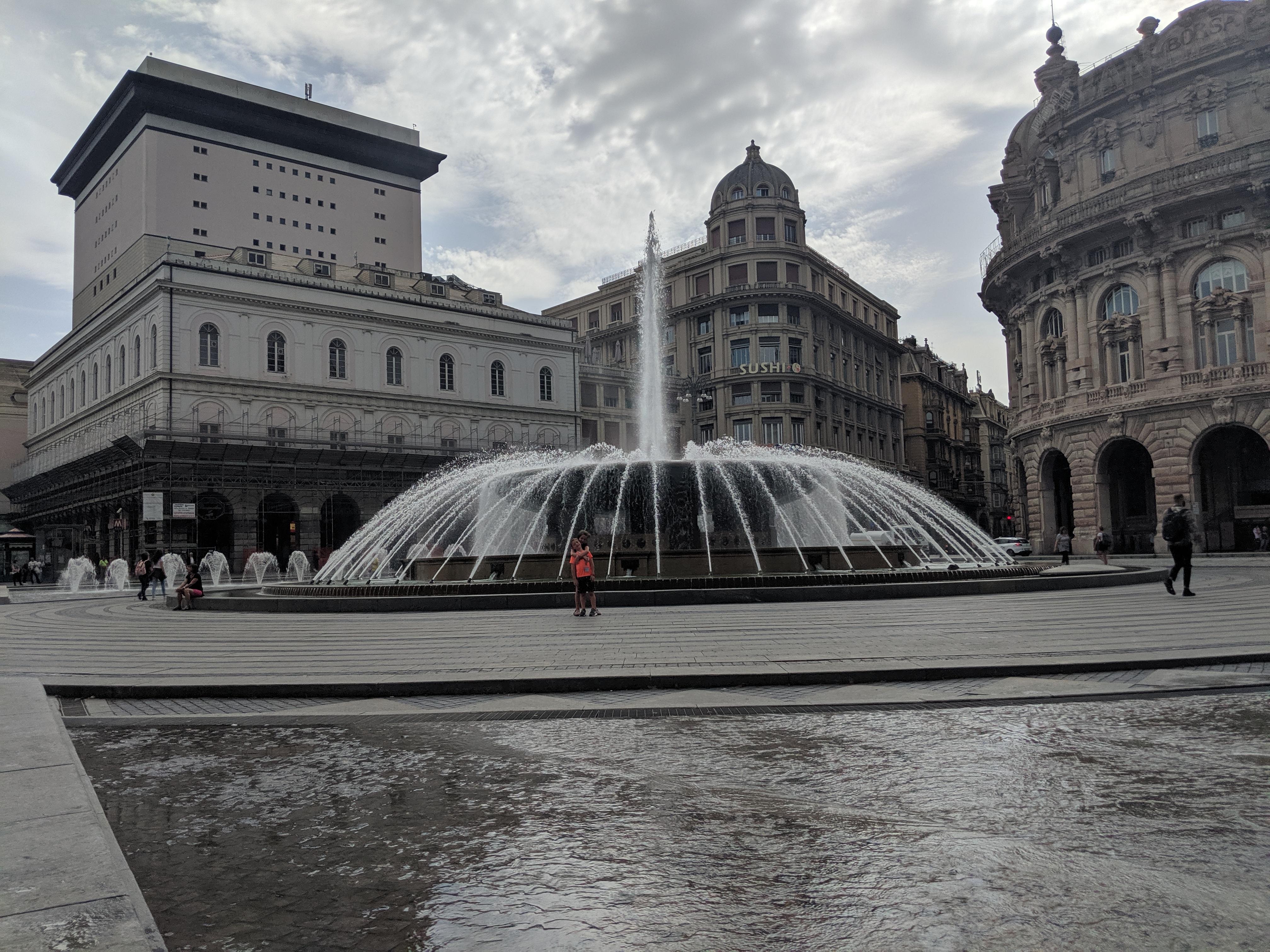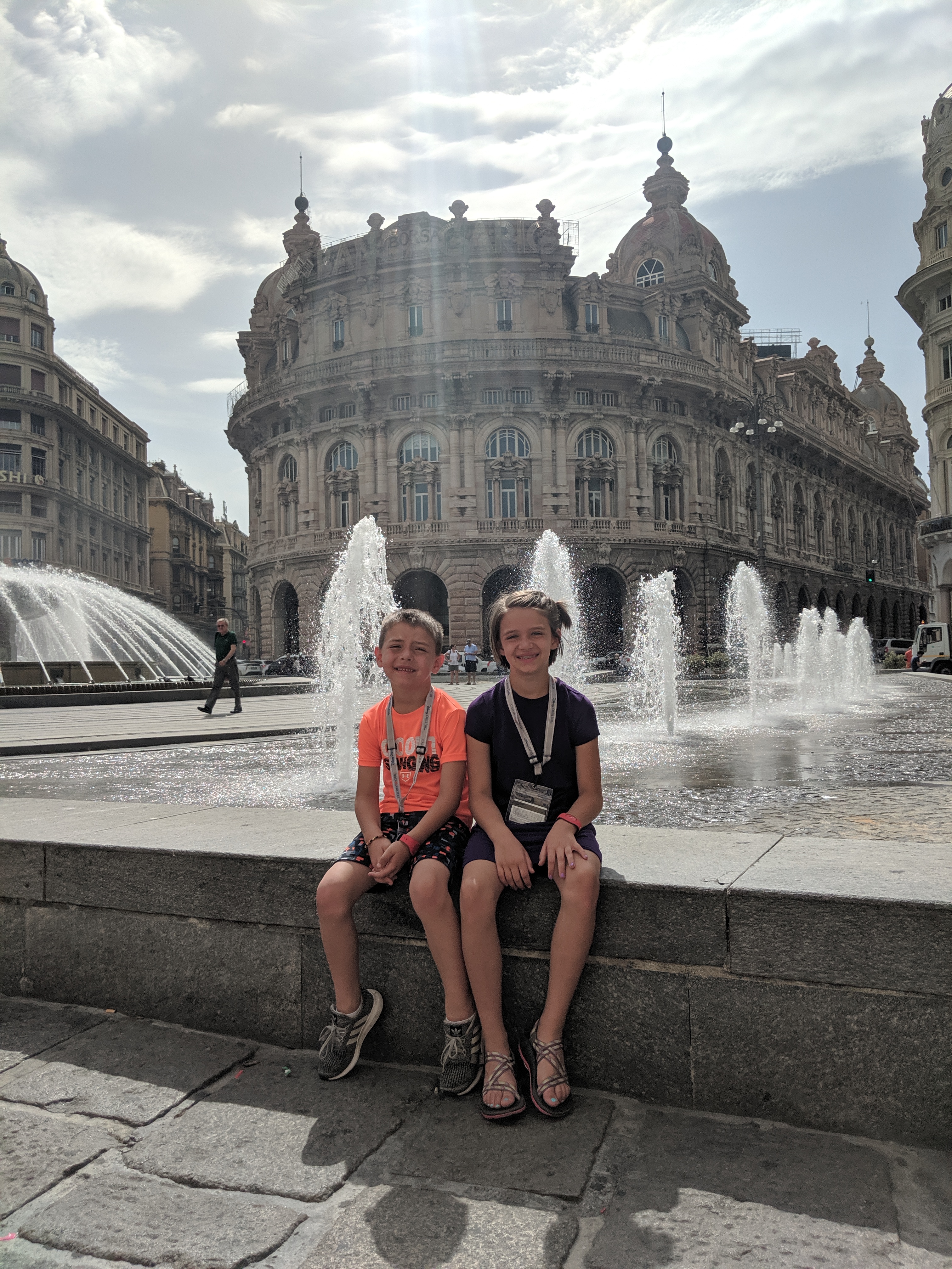 Today, we decided to stay in then Port City of Genova (Genoa). Our plan was to sleep in, walk around Genova, and eat lunch, find wireless internet and head back to the boat. At first, we were not a fan of this port. However, as the day went on we became more comfortable. We first went to Piazza de Ferarri. The kids played in the water awhile before we wandered further.