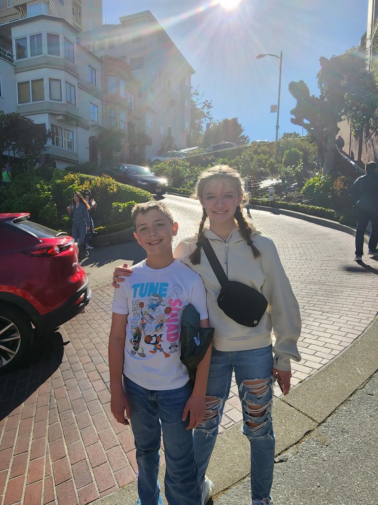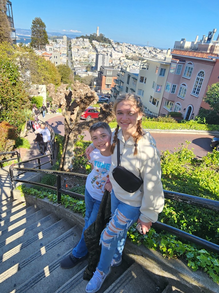 While at Fisherman’s Wharf, we had to visit The Buena Vista and try the Irish Cream coffee. The story goes that the Irish Coffee was brought to the United States via The Buena Vista. The Hyde Street Cable Car stops right outside The Buena Vista. The kids had the Hot Chocolate. We had to get back to the North Shore for supper and we realized Lombard Street was on the way. One thing that Google Maps does not show is the incline it takes to get there. We climbed almost straight up to Lombard Street.