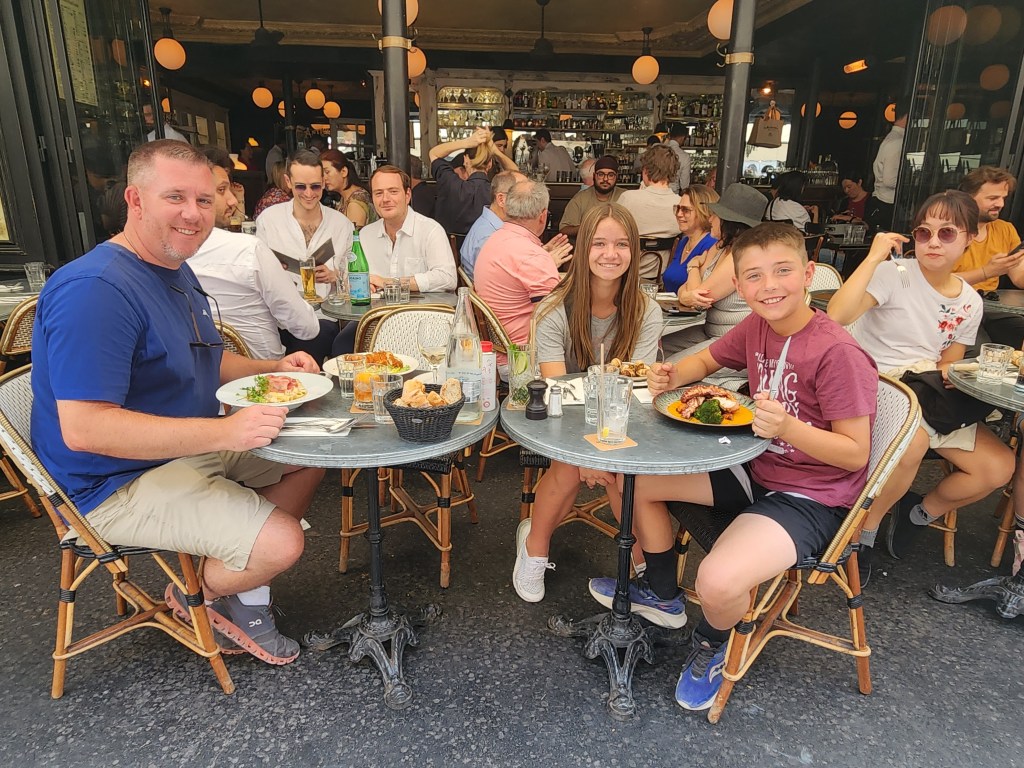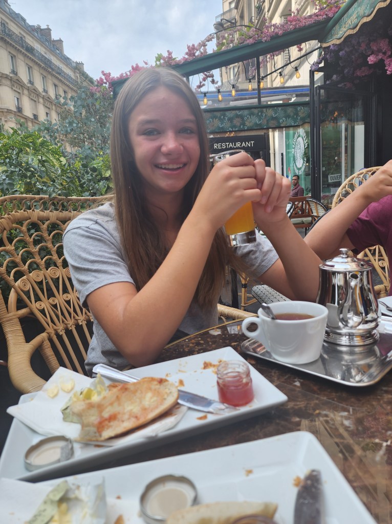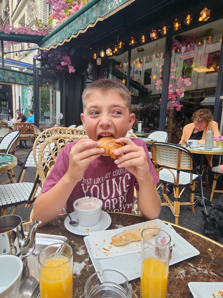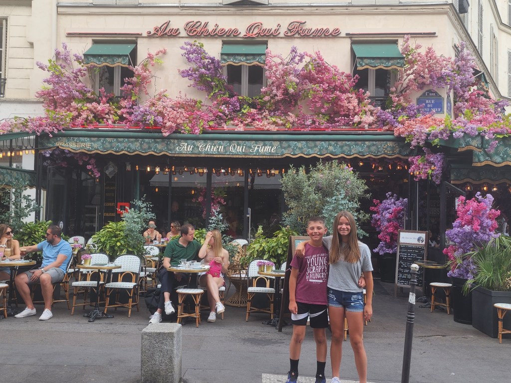 We decided to sleep in a little today since our tour didn’t start until 11:30am. We weren’t that far from the Louvre, so we decided to hoof it. We left the hotel around 9:30 and stopped by a little cafe for breakfast. There is literally a cafe on every corner, and then some. They are all as cute and quaint as you imagined. So we chose ours purely based on how cute it looked. The name “Au Chien Qui Fume” means A Dog that smokes, which feels just about as Parisian as you can get. We all got croissants and the kids loved them.