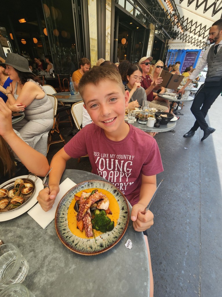 After the Louvre, we headed to lunch. We found a nice, slightly overpriced cafe near the Louvre. Jack had octupus and Kate had escargot, which really surprised me. She loved it.