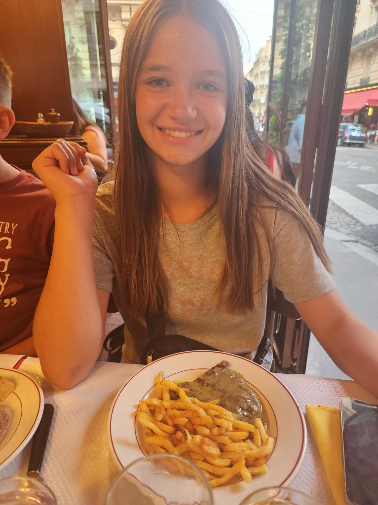 Since we were in the neighborhood, we decided to check out a restaurant my aunt recommended. Relais l’Entrecote serves one thing, steak and frites. We got there right after they opened (6:45pm) and a line was wrapped around the block. We decided we had nothing else to do, so we waited it out. We got seated after about an hour of waiting in line. After we were seated they asked for our drink order and how we liked our steak. After that, our food came quickly and it did not disappoint.
