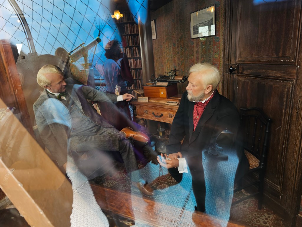 Once at the top of the tower, it is very crowded. There is a replica of the office Eiffel kept at the top depicting Eiffel and Thomas Edison meeting there. Dan bought us champagne from The Champagne Bar at the top. We took in the sights and headed back down.