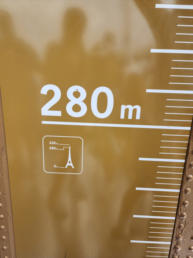 Our climb to the first floor took 327 steps and maybe 15 minutes. The first floor stands at 187 feet high. At the first floor, there was restrooms, a quick service, a bistro, and a gift shop. If you look at the Eiffel Tower, there is much more room on the first platform than the second, so there is more services there and it is much less crowded. At the first floor, we got more information from the guide. Here are some facts we learned: