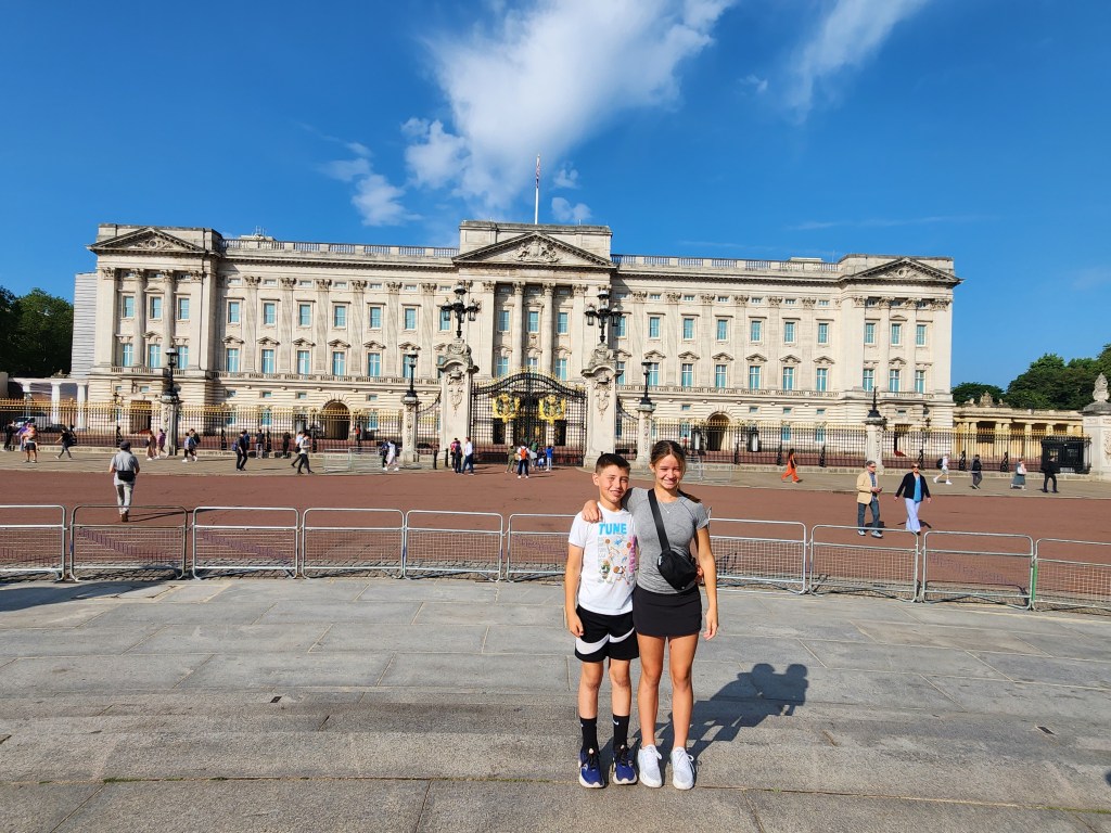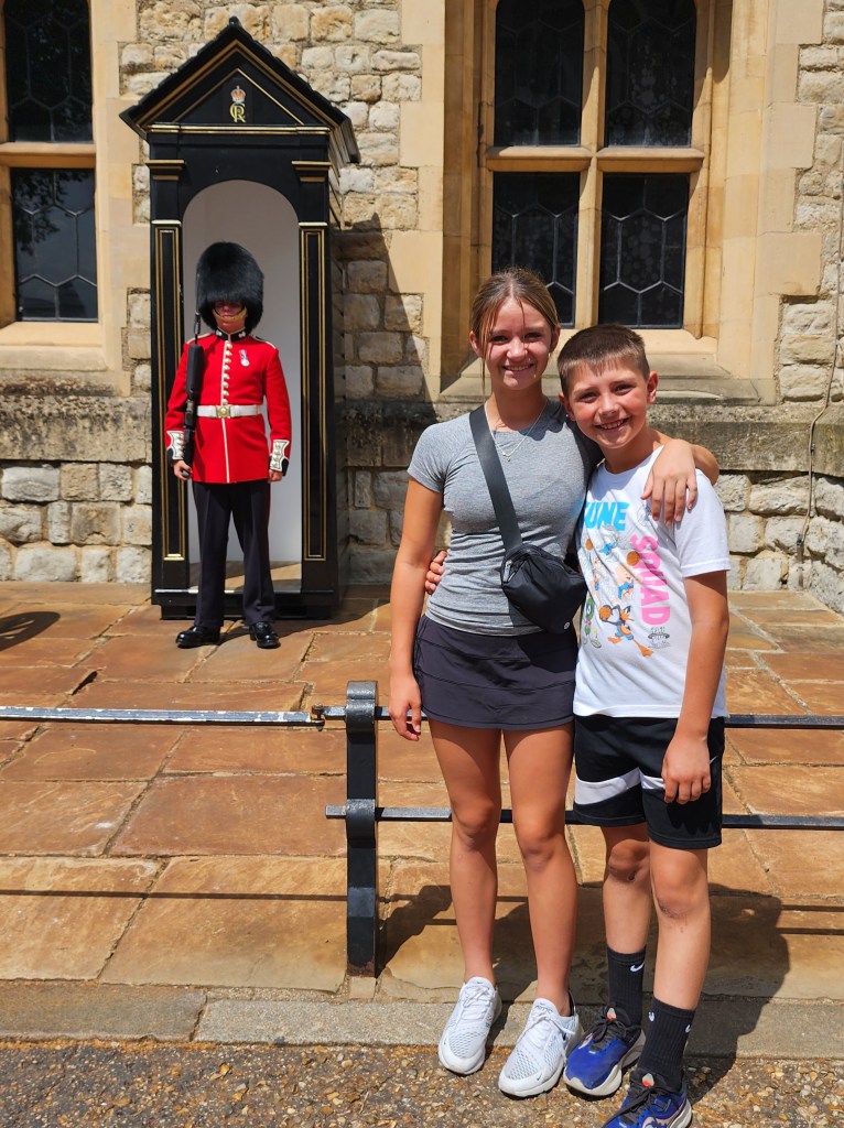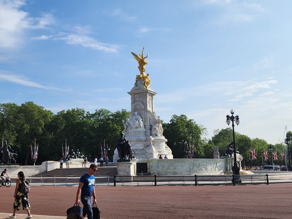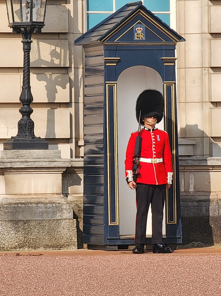 Today, we took an all-day tour of London in a big tour bus, which I really dislike doing. I am guessing I didn’t read the description fully, but it did hit all the places we were looking to hit. We started our day at the Buckingham Palace, the royal residence. For the last few generations, the Royals have spent less and less time here and more time at the much favored Windsor Castle. The flag flying at the top of the Palace is the flag of Britain, indicating that the King is NOT in residence. Above the guard, you can still see it is ER with a little II in teh middle. This stands for Elizabeth Regina II or Queen Elizaebeth the Second. Throughout London, we saw a mixture of the new cypher for King Charles and the old cypher for Queen Elizabeth.