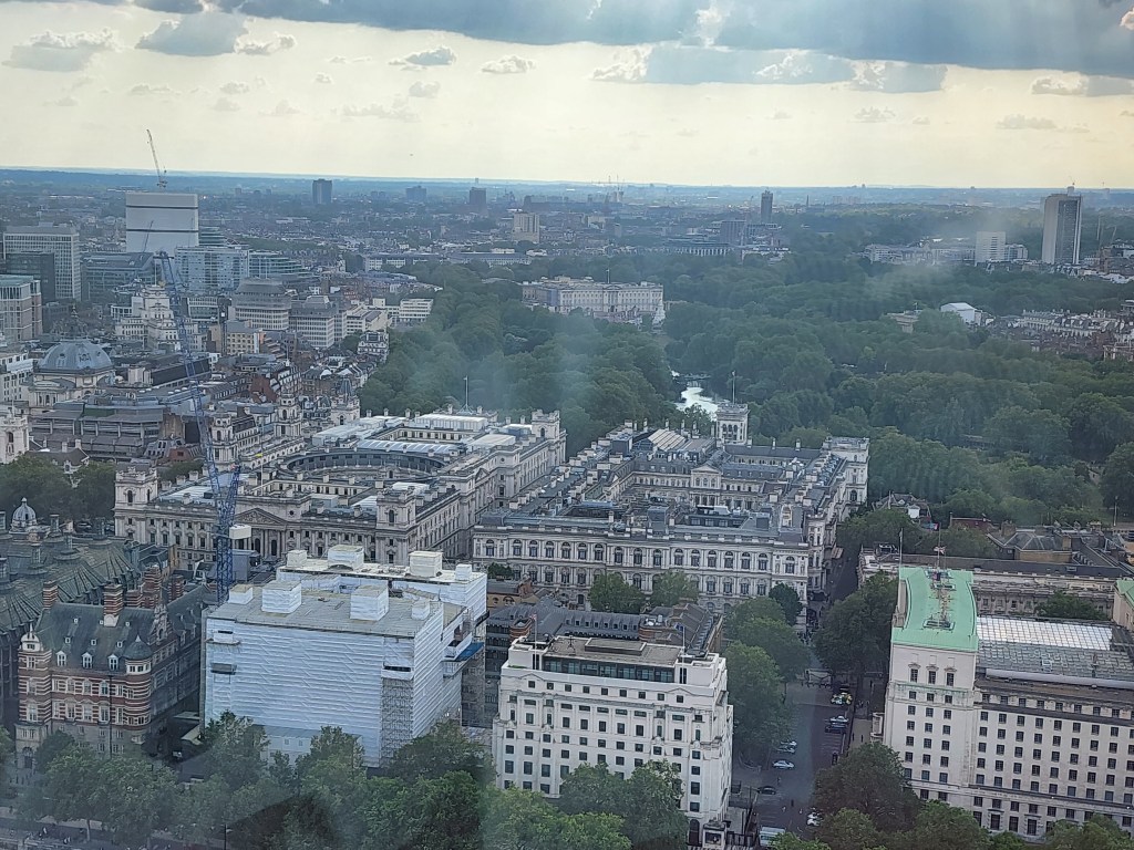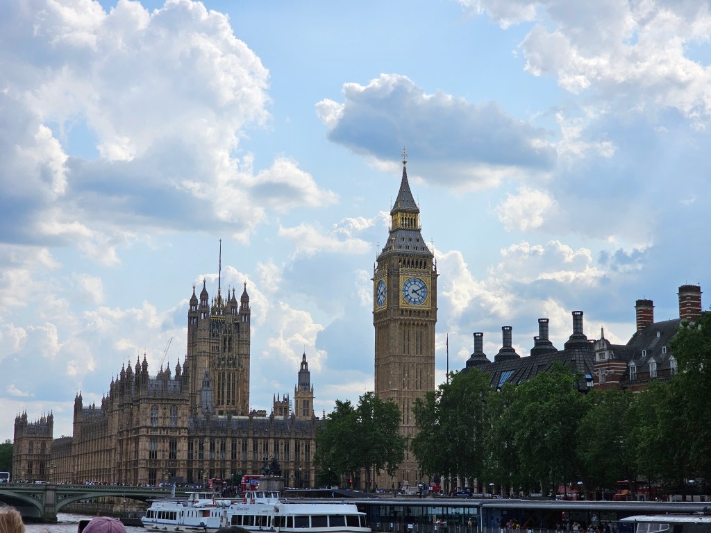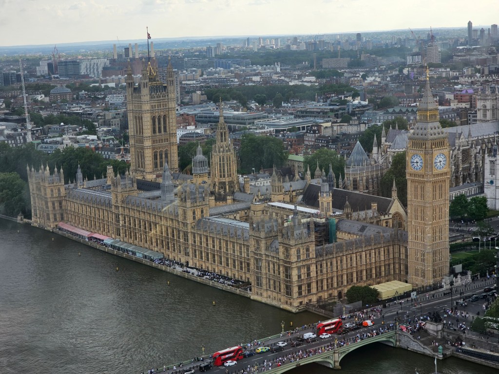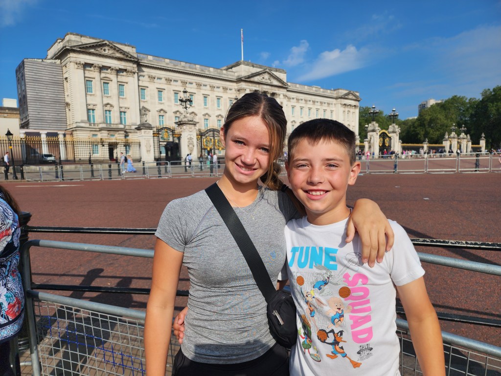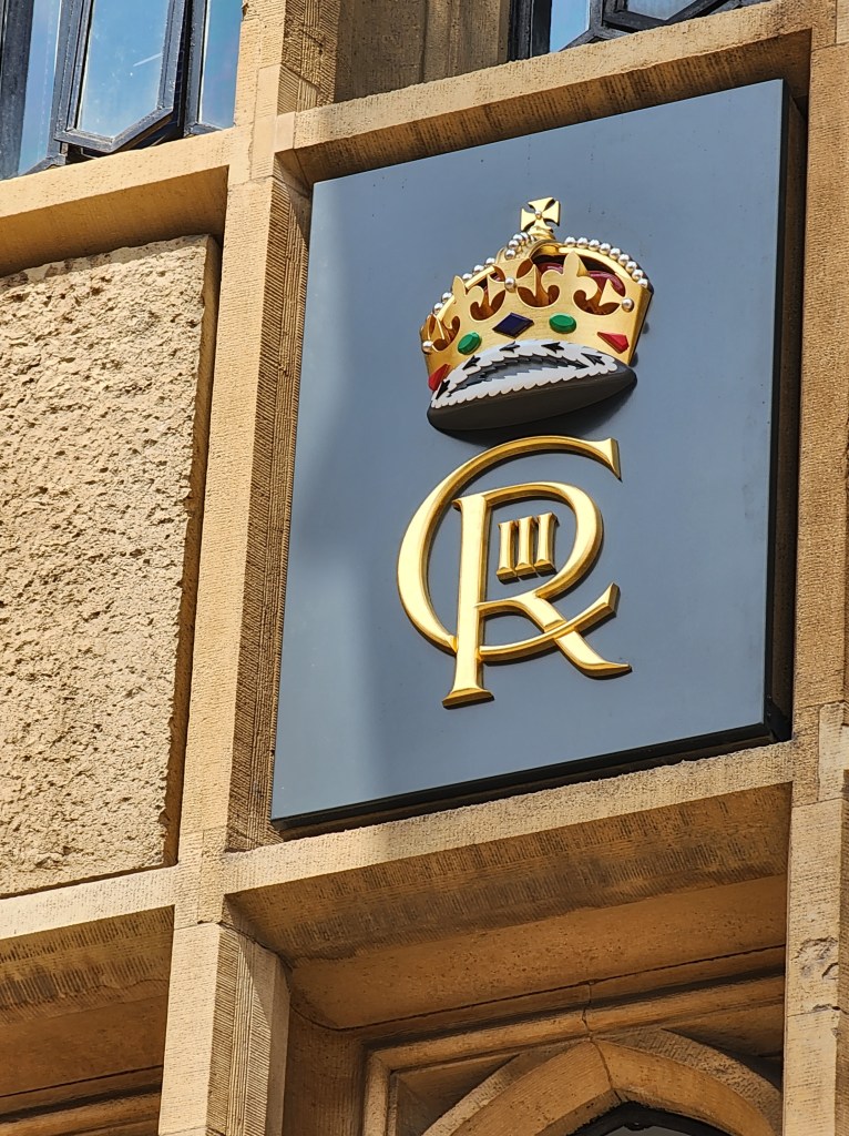 Today, we took an all-day tour of London in a big tour bus, which I really dislike doing. I am guessing I didn’t read the description fully, but it did hit all the places we were looking to hit. We started our day at the Buckingham Palace, the royal residence. For the last few generations, the Royals have spent less and less time here and more time at the much favored Windsor Castle. The flag flying at the top of the Palace is the flag of Britain, indicating that the King is NOT in residence. Above the guard, you can still see it is ER with a little II in teh middle. This stands for Elizabeth Regina II or Queen Elizaebeth the Second. Throughout London, we saw a mixture of the new cypher for King Charles and the old cypher for Queen Elizabeth.