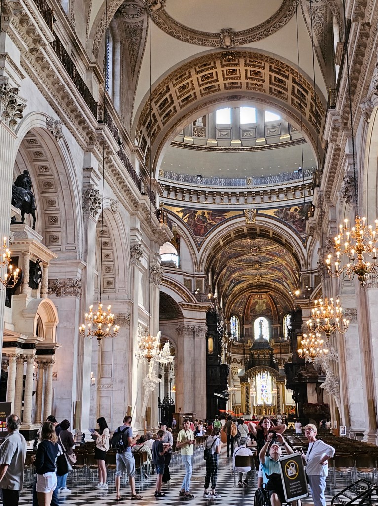 After Buckingham, we headed to St. Paul’s Cathedral. St. Pauls Cathedral is an anglican church that is the seat for the Bishop in London. Construction started in 1675 and the architect was Christopher Wren. St. Paul’s Cathedral survived the great London fire and the two wars, where bombs dropped around it. Christopher Wren designed it to be a simple church, but as you can see, it has been beautifully adorned since his time.