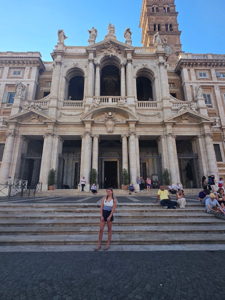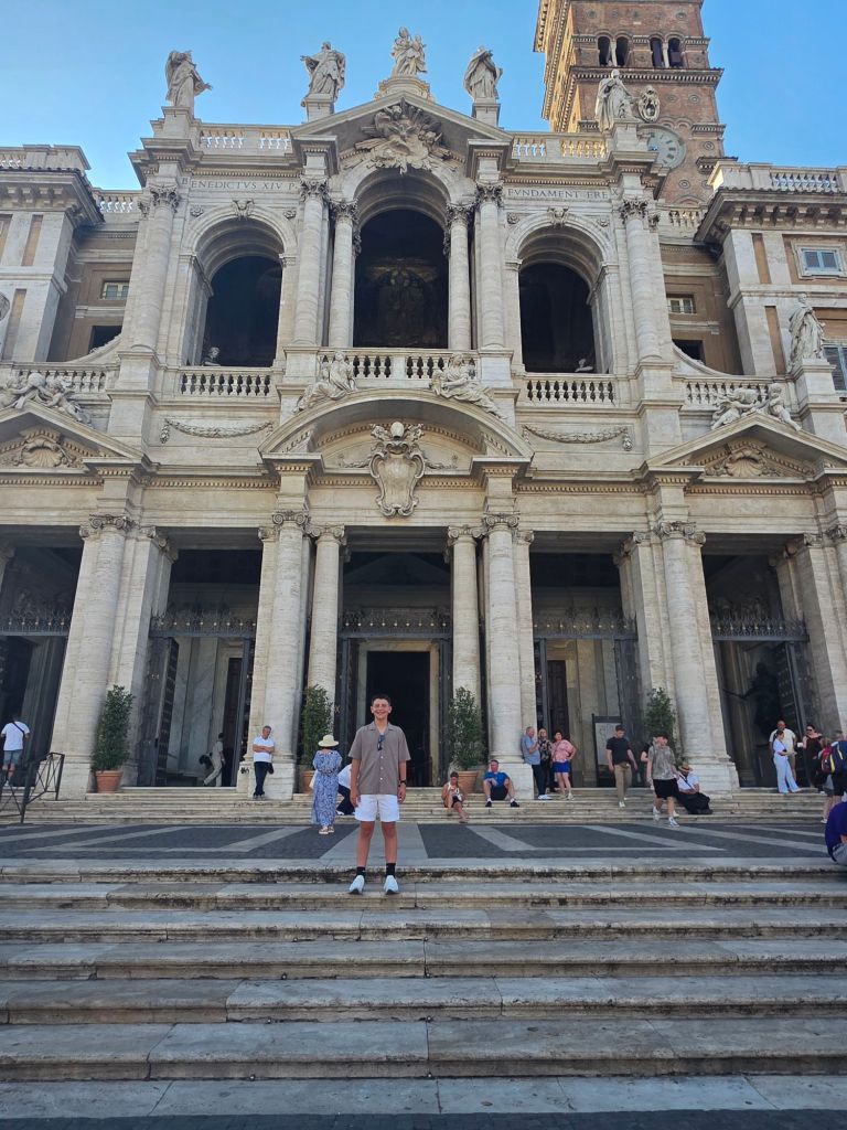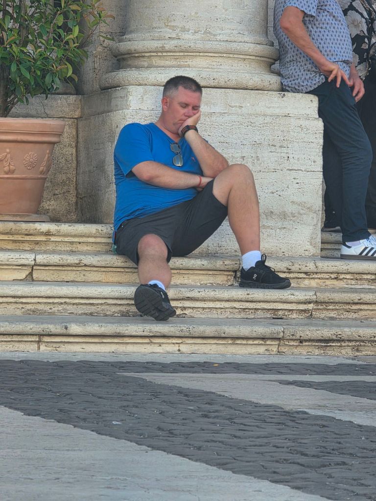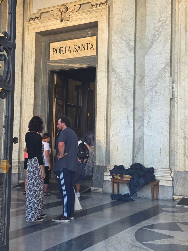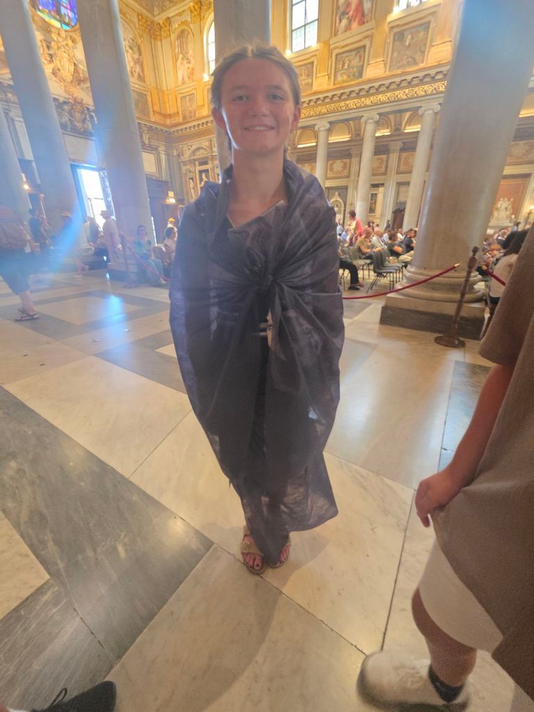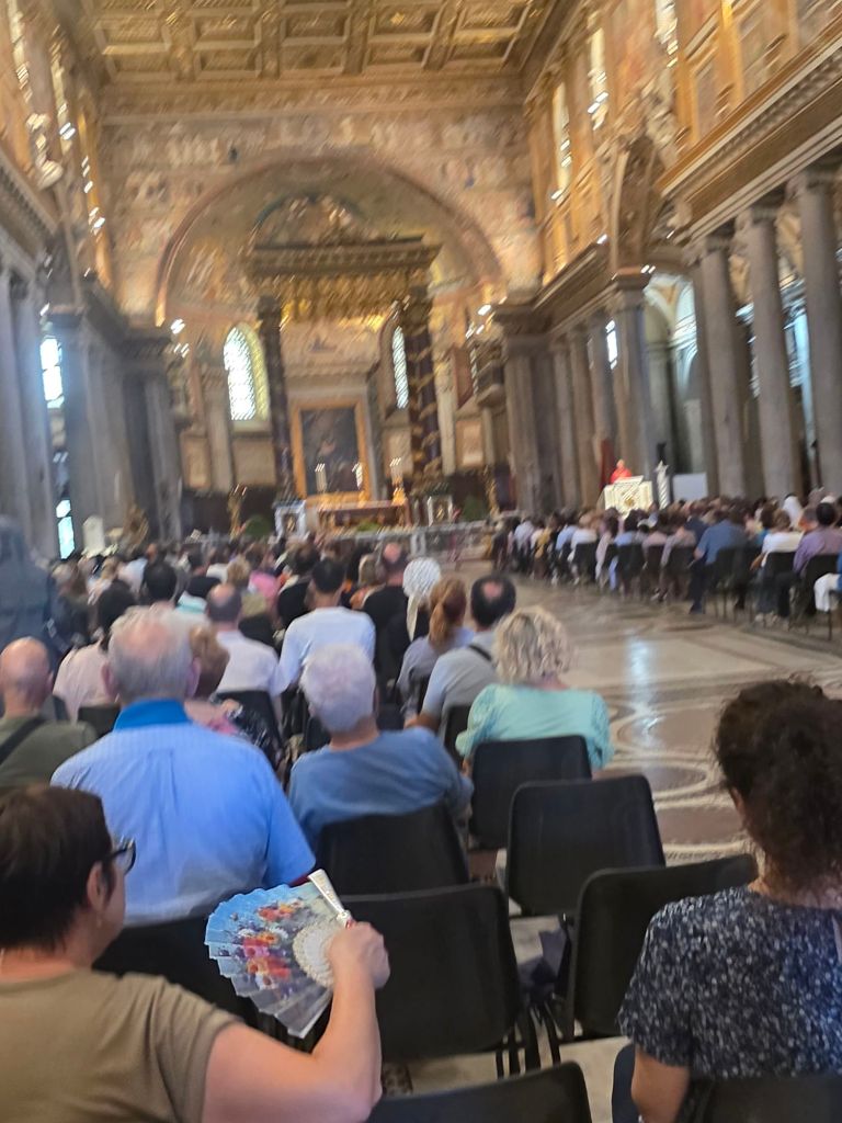 After lunch, we decided to walk to the Basilica Papale di Santa Maria Maggiore. This is the basilica that Pope Francis is buried in. When we got there, Mass was in session so we were not able to view the altar, which houses the Royal Crib. We did see Pope Francis’ tomb. Because this is a Jubilee year, the holy door was open. Since we were not necessarily planning on visiting a holy place today, we were not dressed appropriately. Thankfully, they had these “wraps” at the door, so we were still able to get in. I wish we had grabbed the audio for the guided tour because I think this church had so much more to offer than what we were able to see. Also, with mass going on while we were there, it was crowded and hard to get around. However, at this point, jet lag and heat were taking their toll on us. We left at around 6:45 and headed back to the hotel and took a nap.