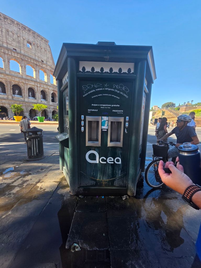 It is my hope that I can convey to you the magnitude of this heat at 9am in the morning. It was so hot, with little shade. The good thing is that Rome has water fountains all over. Dan and I each took a water bottle and were refilling it at every stop. Below is a picture of a fountain outside of the Colosseum offering Still and Sparking water. Most water fountains weren’t this fancy, just a spigot, but we were assured it was clean drinking water and encouraged to fill our bottles.