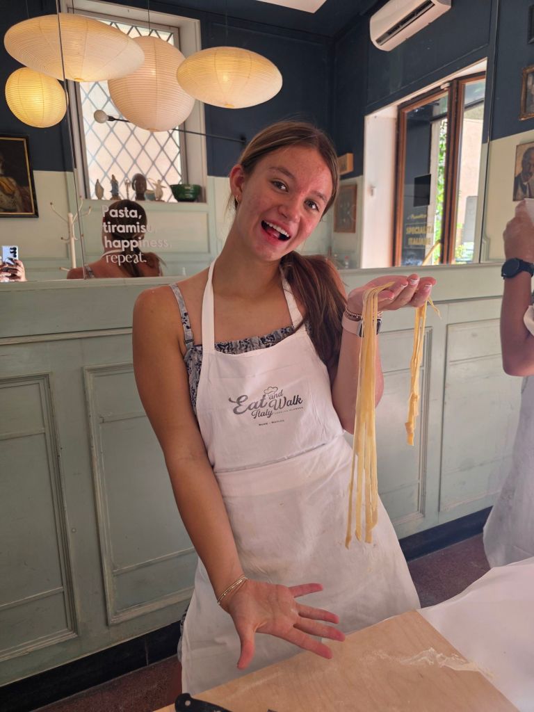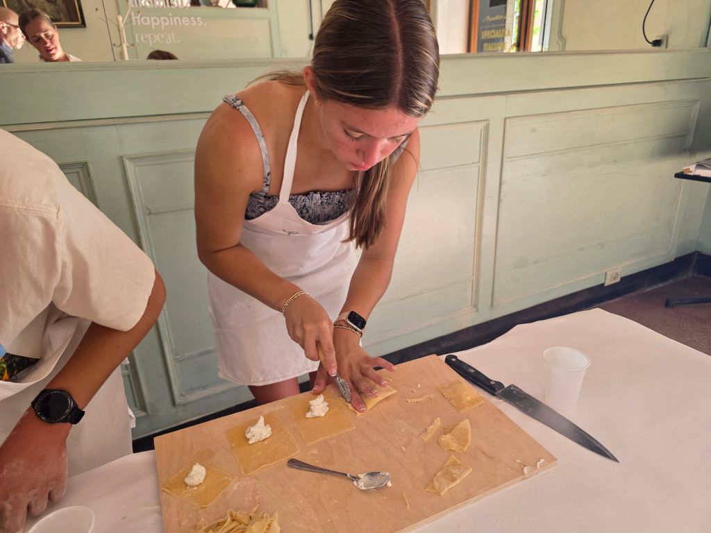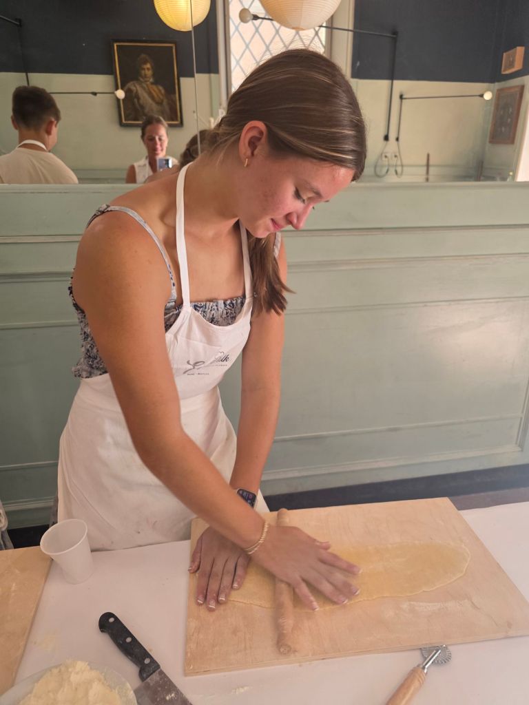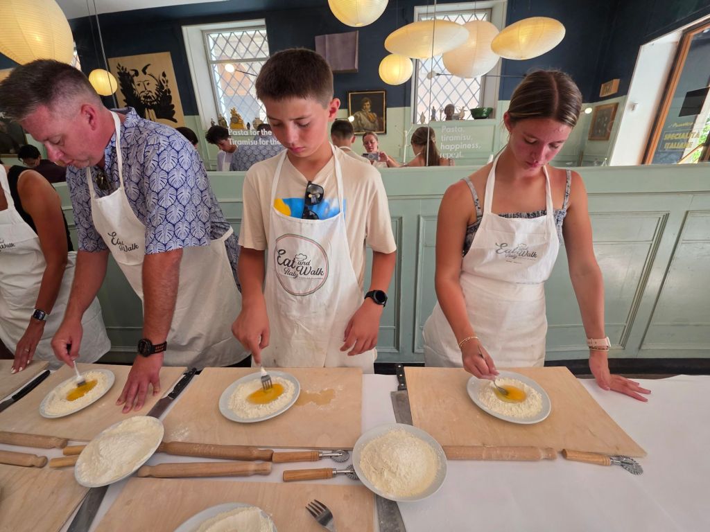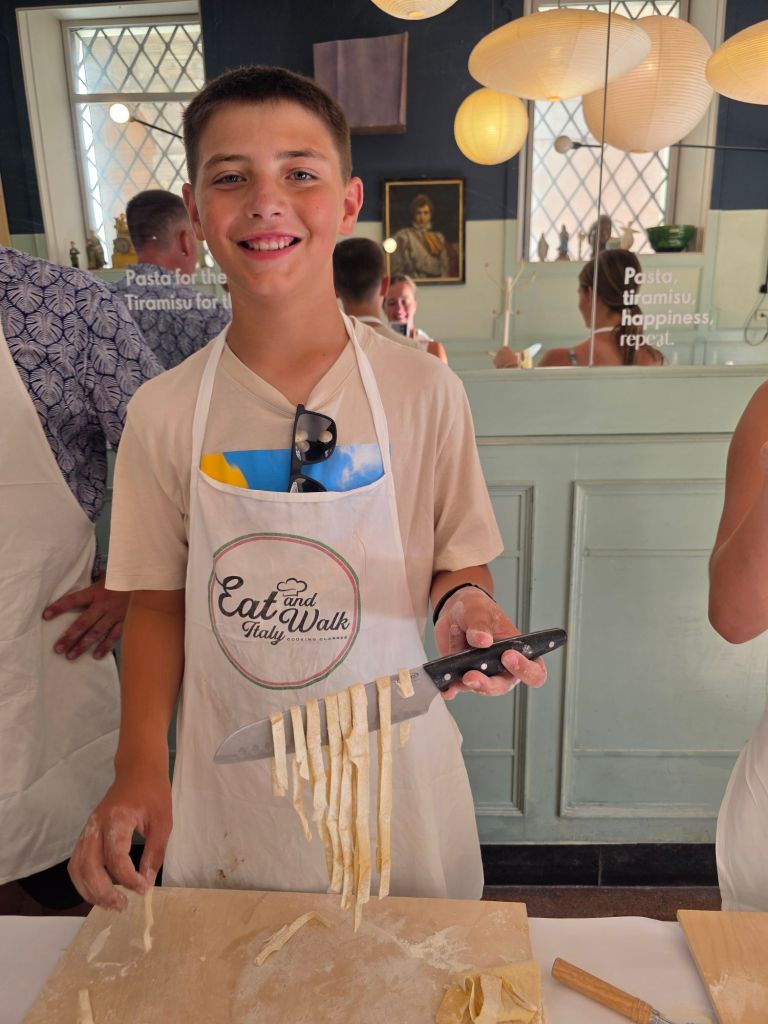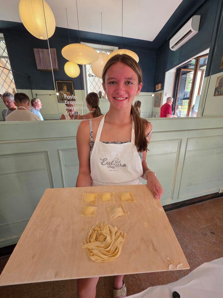 Next, we had to get to our cooking class, which was also booked on Viator. In our class, we made our own ravioli, fettucine, and tiramisu. The class was easy and fun, but also, you guessed it, hot. After we made the food, we got to eat it. The family sitting next to us is going on our cruise tomorrow, so that was fun.