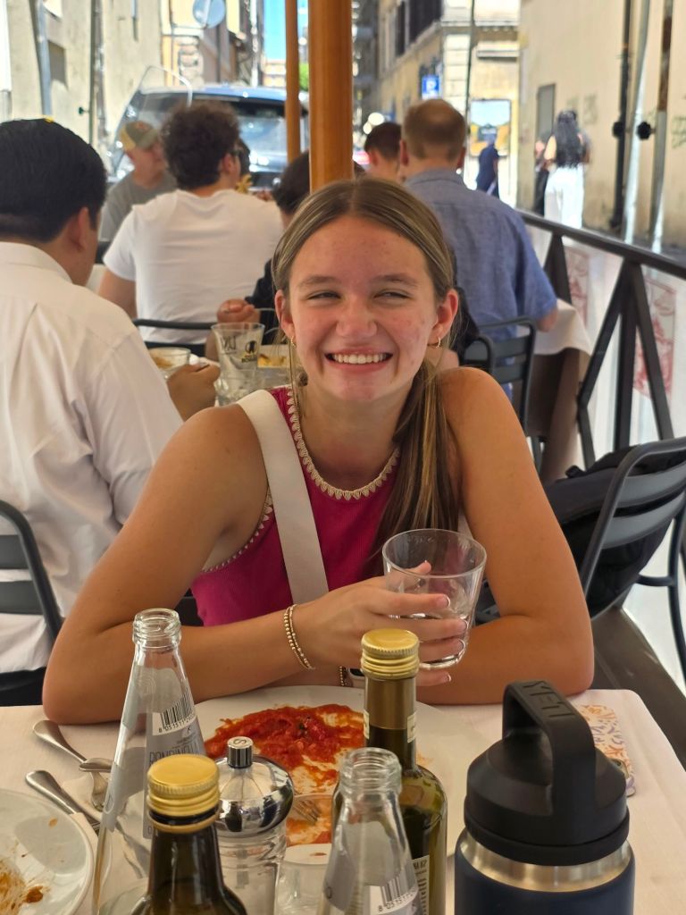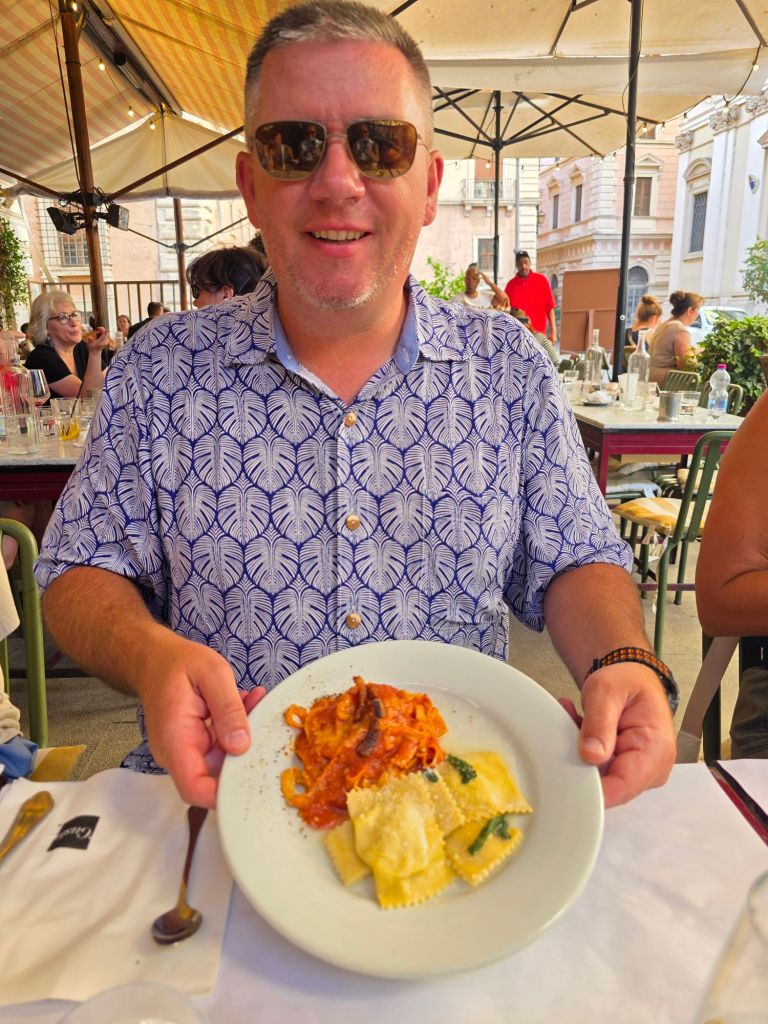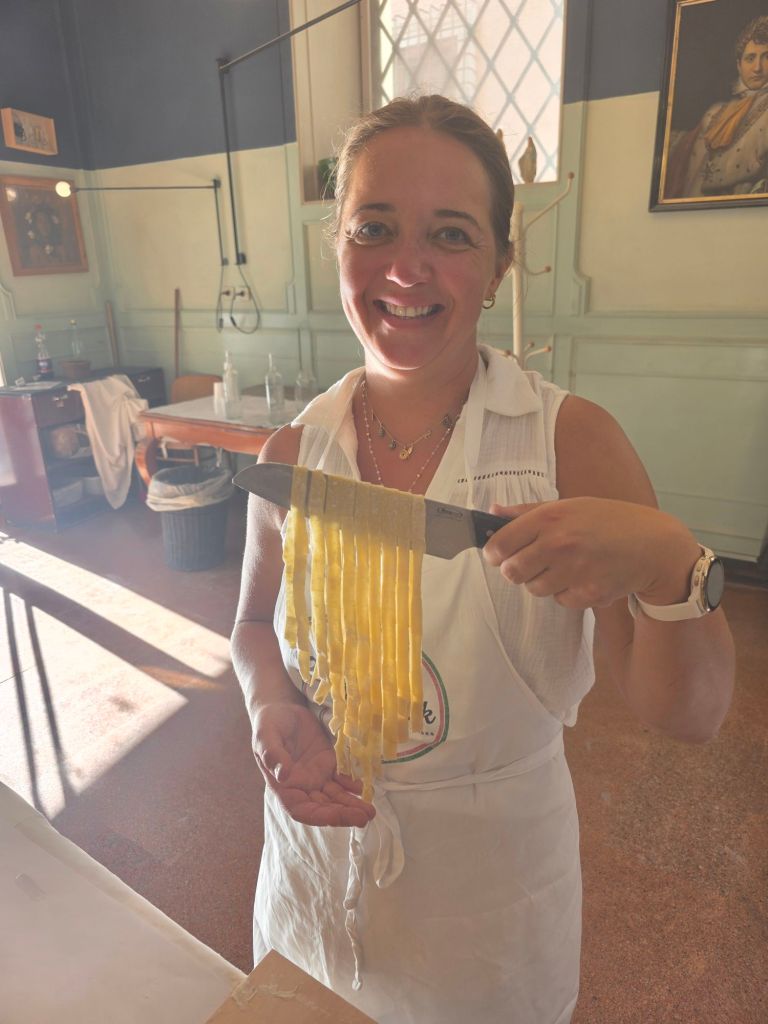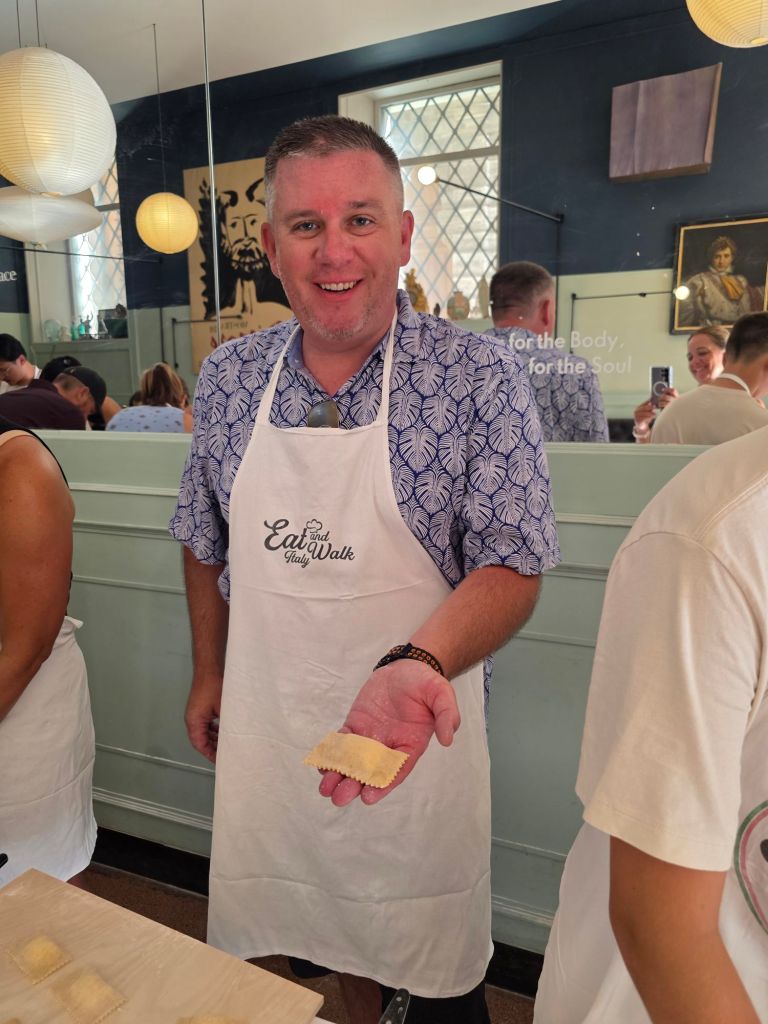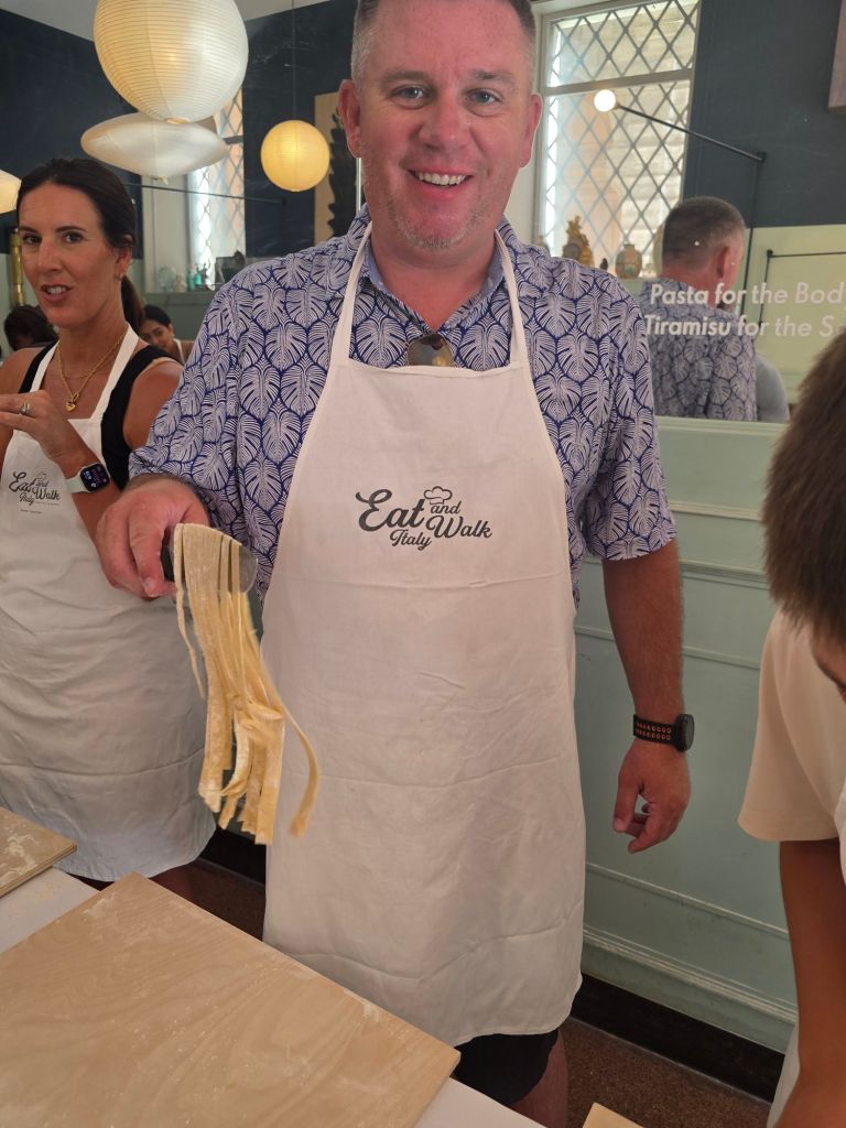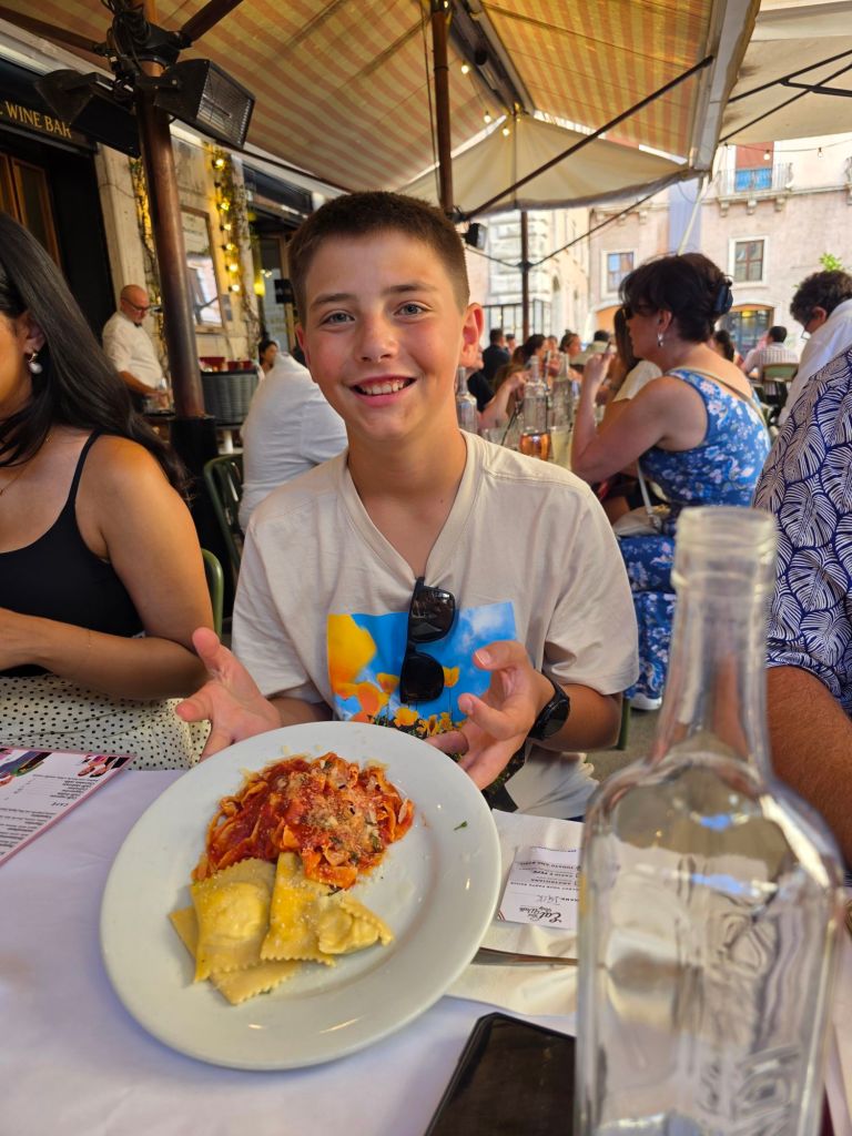 Next, we had to get to our cooking class, which was also booked on Viator. In our class, we made our own ravioli, fettucine, and tiramisu. The class was easy and fun, but also, you guessed it, hot. After we made the food, we got to eat it. The family sitting next to us is going on our cruise tomorrow, so that was fun.