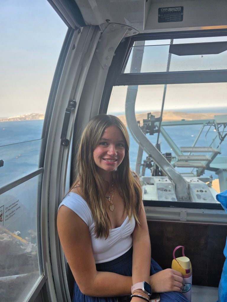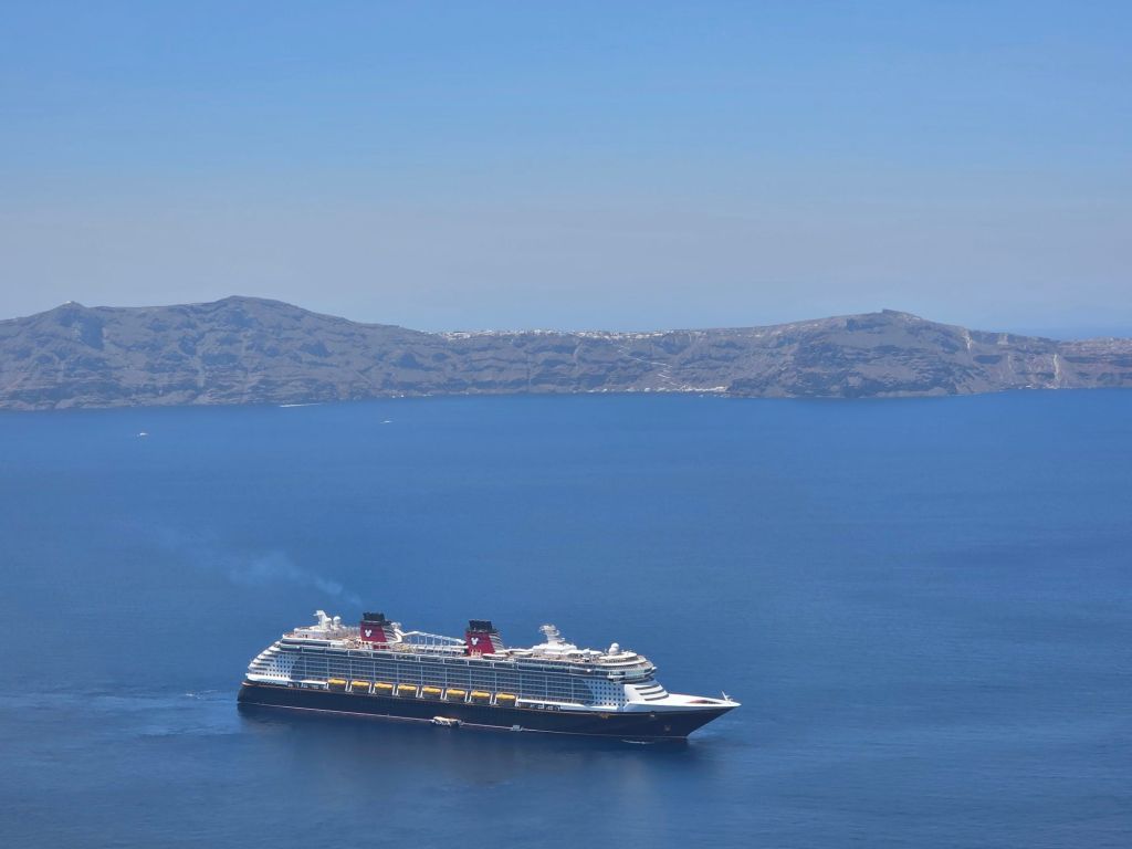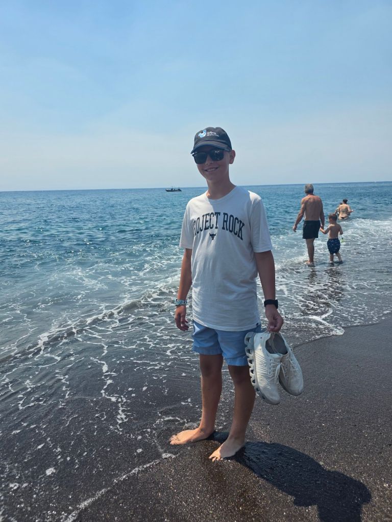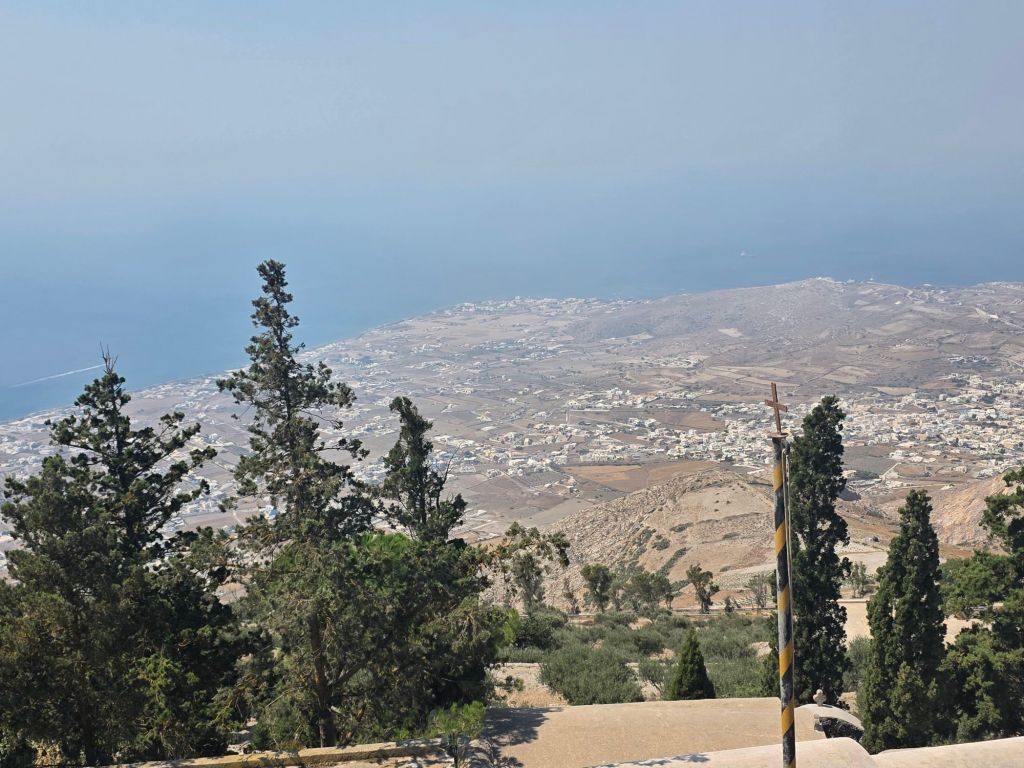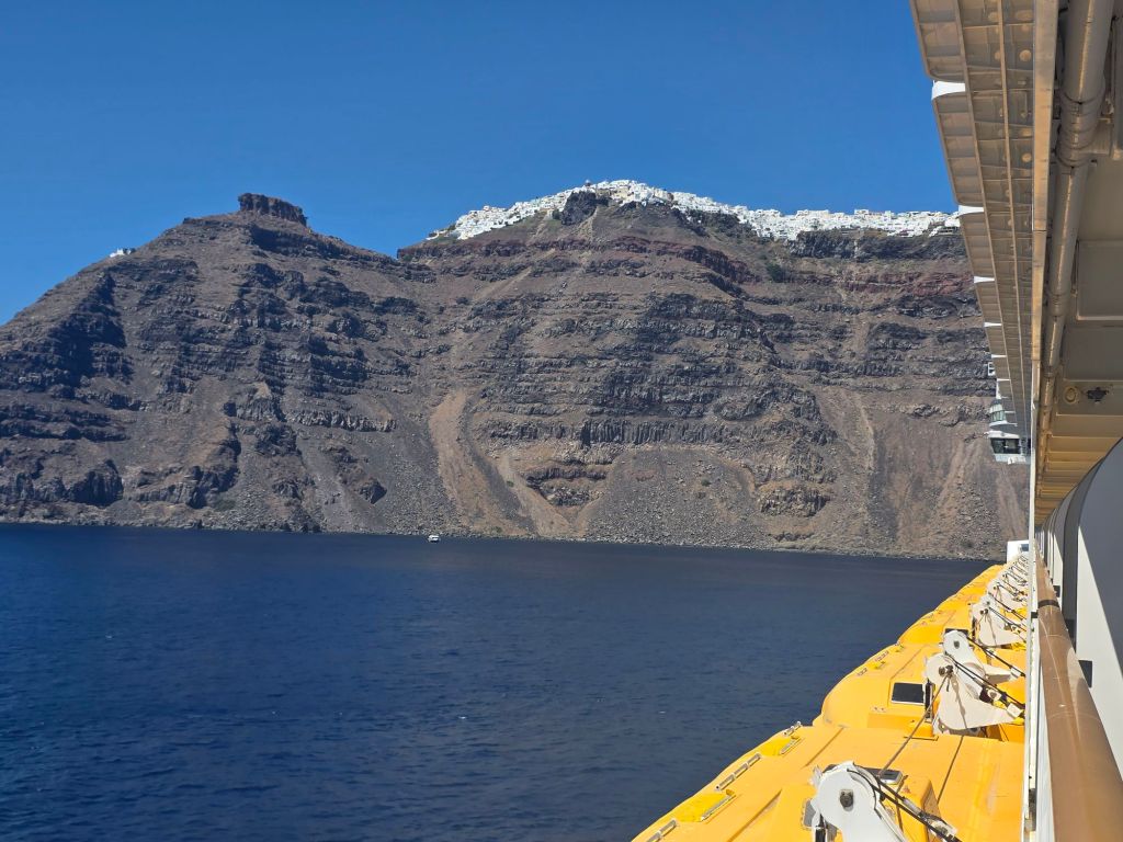 From our ship, we tendered into port, then took a cable car up to the town of Fira, on top of the cliffside. We had a tour guide driving us around today and he took us around the entire island while explaining the history of the island. Santorini is surrounded by volcanoes, so most of the rock is lava rock and pumice. We visited a Greek Orthodox Church, a monastery, and a black sand beach. We had lunch at an authentic Greek restaurant in a little village. We learned that they don’t grow their grapes on vines, but in little vortex on the ground.