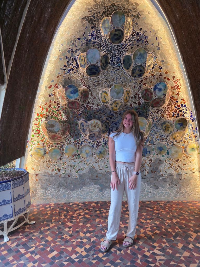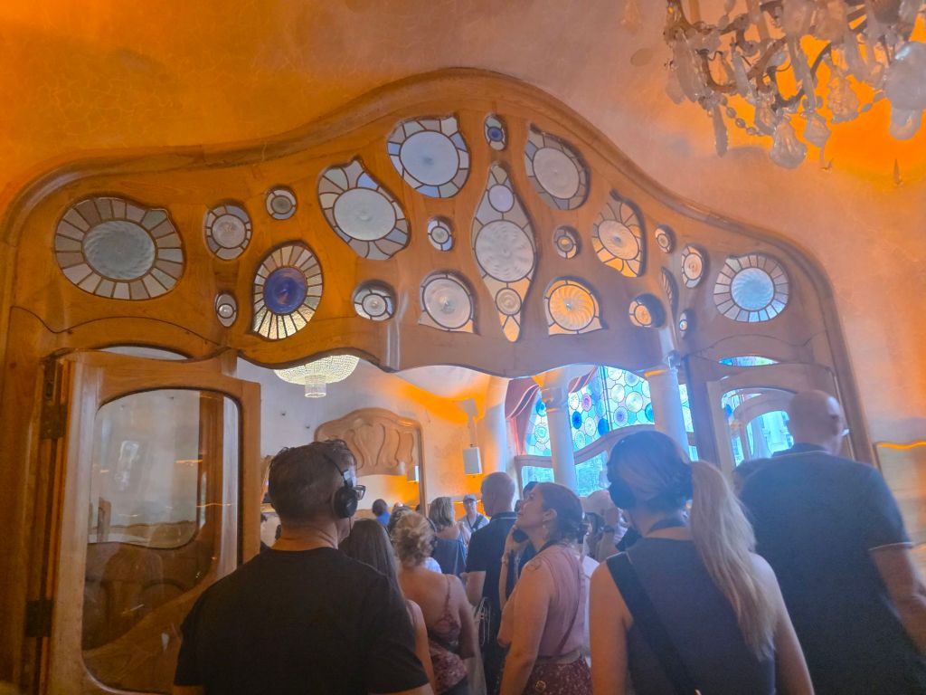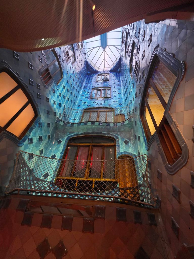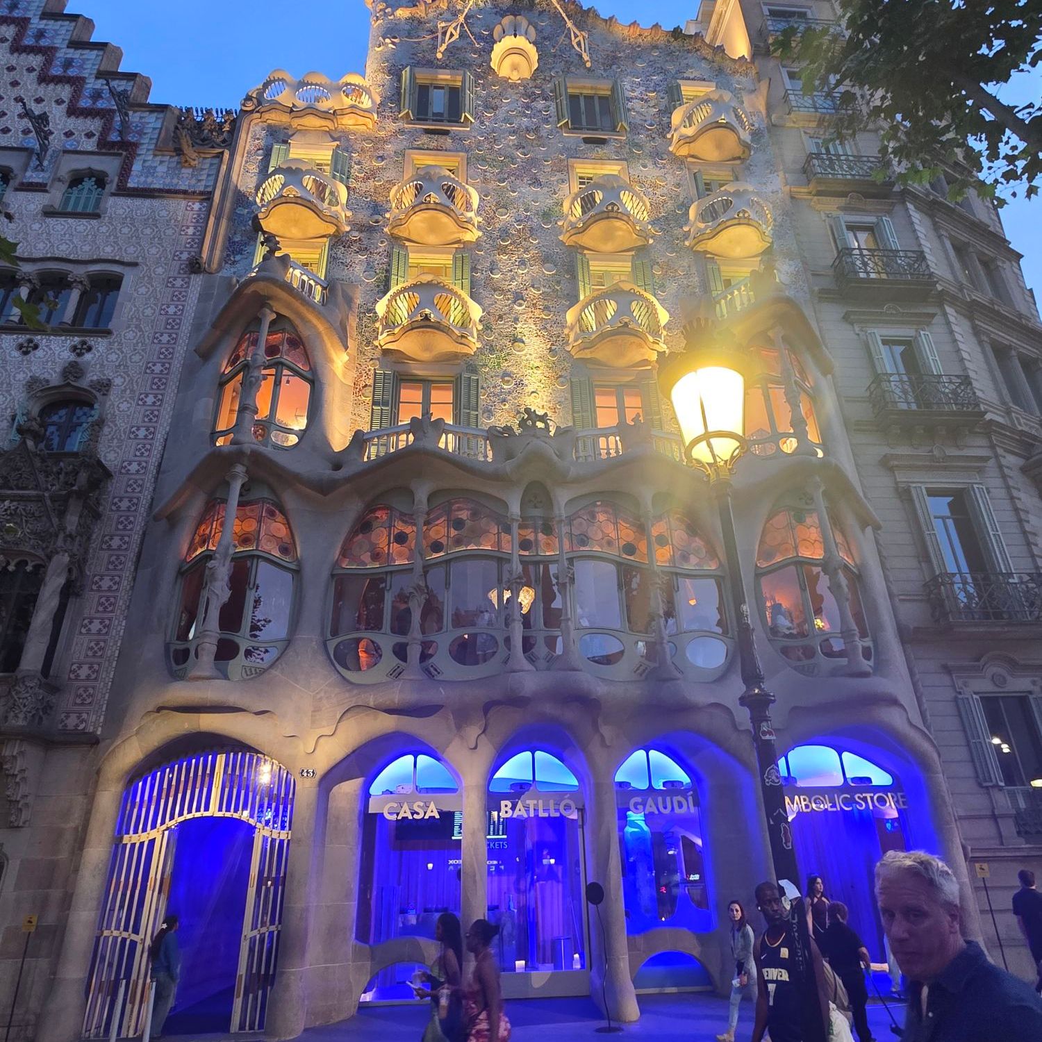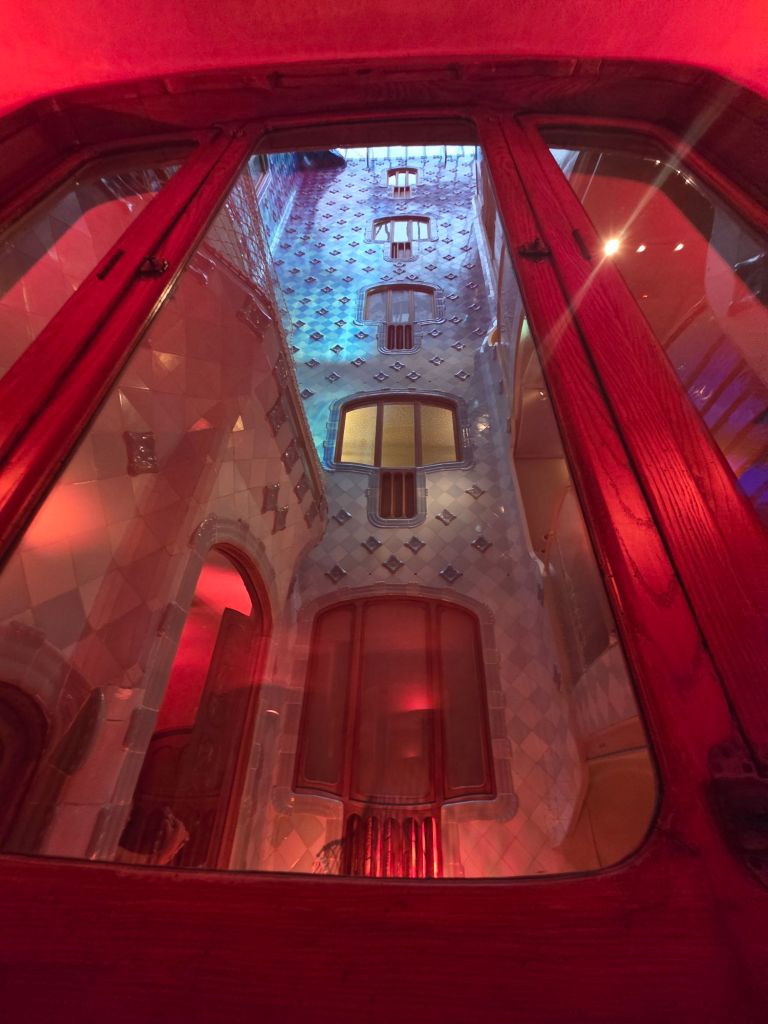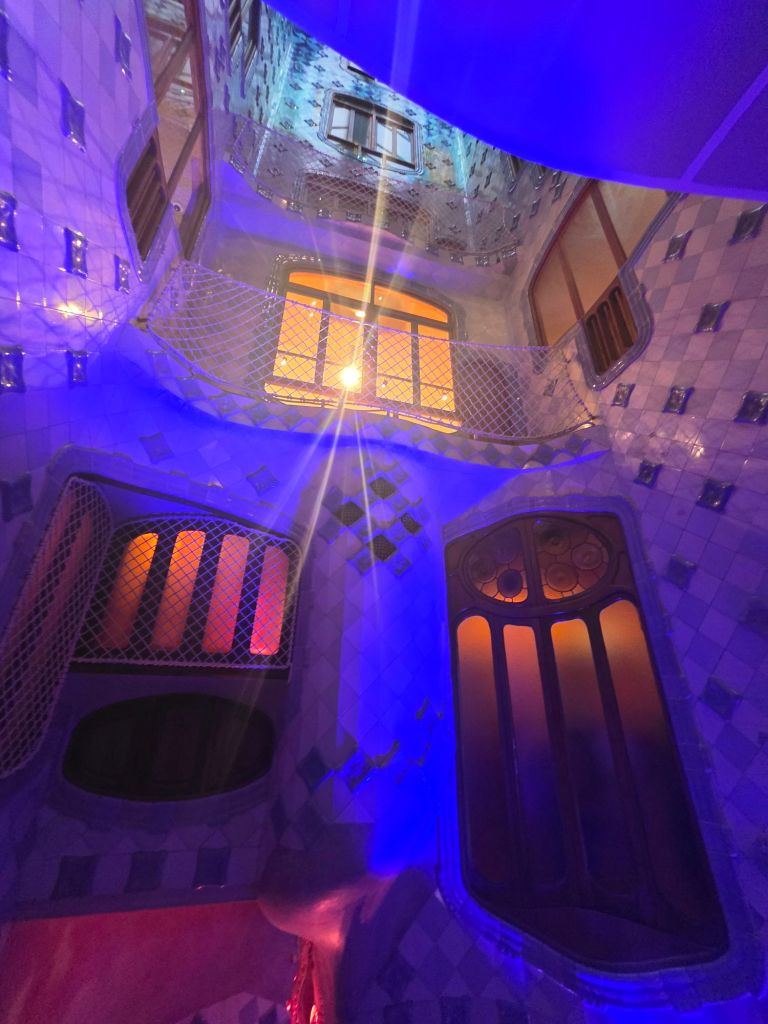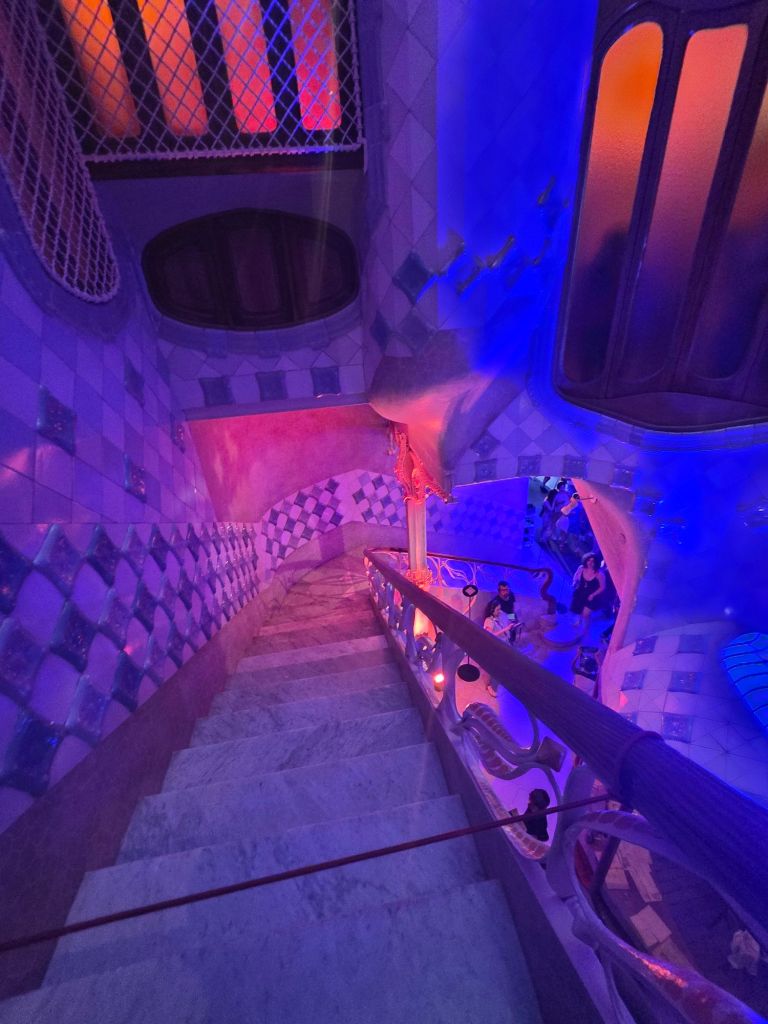 After the wax museum, we decided to visit Casa Battlo. Casa Battlo was designed by Gaudi, who also was the architect of La Sagrada Familia, Park Guell, and other sites around Barcelona. He is known for his use of color, light, and mosaics. I absolutely love visiting his work. We visited the house at night, and there was all kinds of lighting that made it extra special.